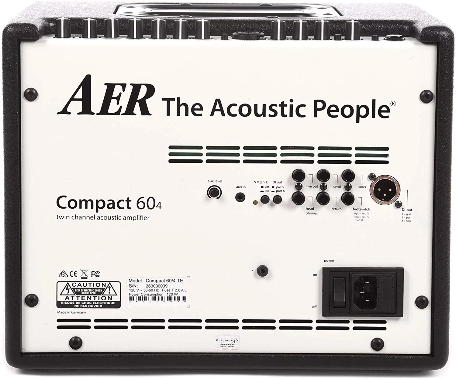 Модель 2018 года, AER Compact 60-4 имеет два независимых канала: Ch 1 - 6,3mm (1/4) Jack - линейный вход с высоким сопротивлением, подавлением сигнала "PAD", регулировкой уровния сигнала и переключателем фантомного питания 9V. Ch 2 - комбинированный XLR/6,3mm (1/4) Jack - высококачественный линейный или сбалансированный микрофонный вход с фантомным питанием 48V/9V и регулировкой уровня сигнала;