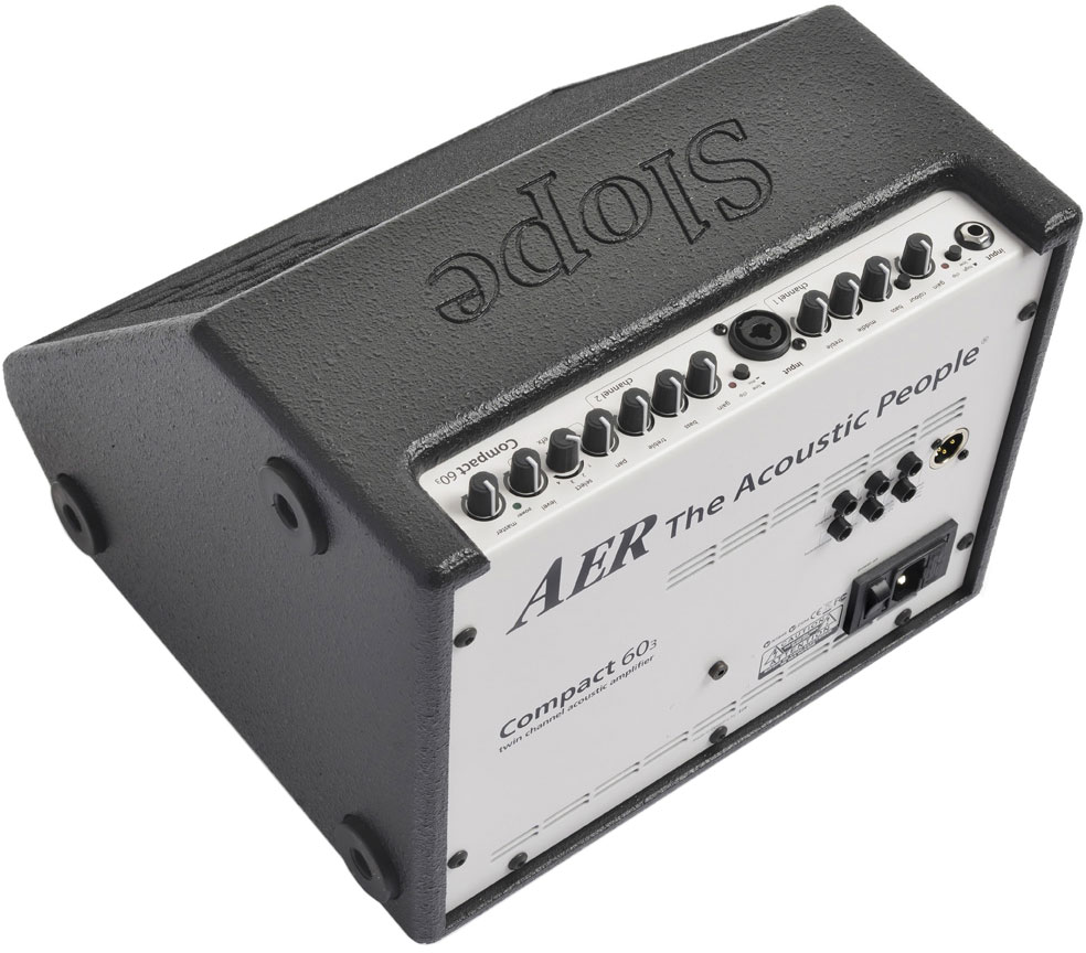 AER Compact Slope имеет два независимых канала: Ch 1 - 6,3mm (1/4) Jack - линейный вход с высоким сопротивлением, подавлением сигнала "PAD", регулировкой уровния сигнала и переключателем фантомного питания 9V. Ch 2 - комбинированный XLR/6,3mm (1/4) Jack - высококачественный линейный или сбалансированный микрофонный вход с фантомным питанием 48V/9V и регулировкой уровня сигнала;