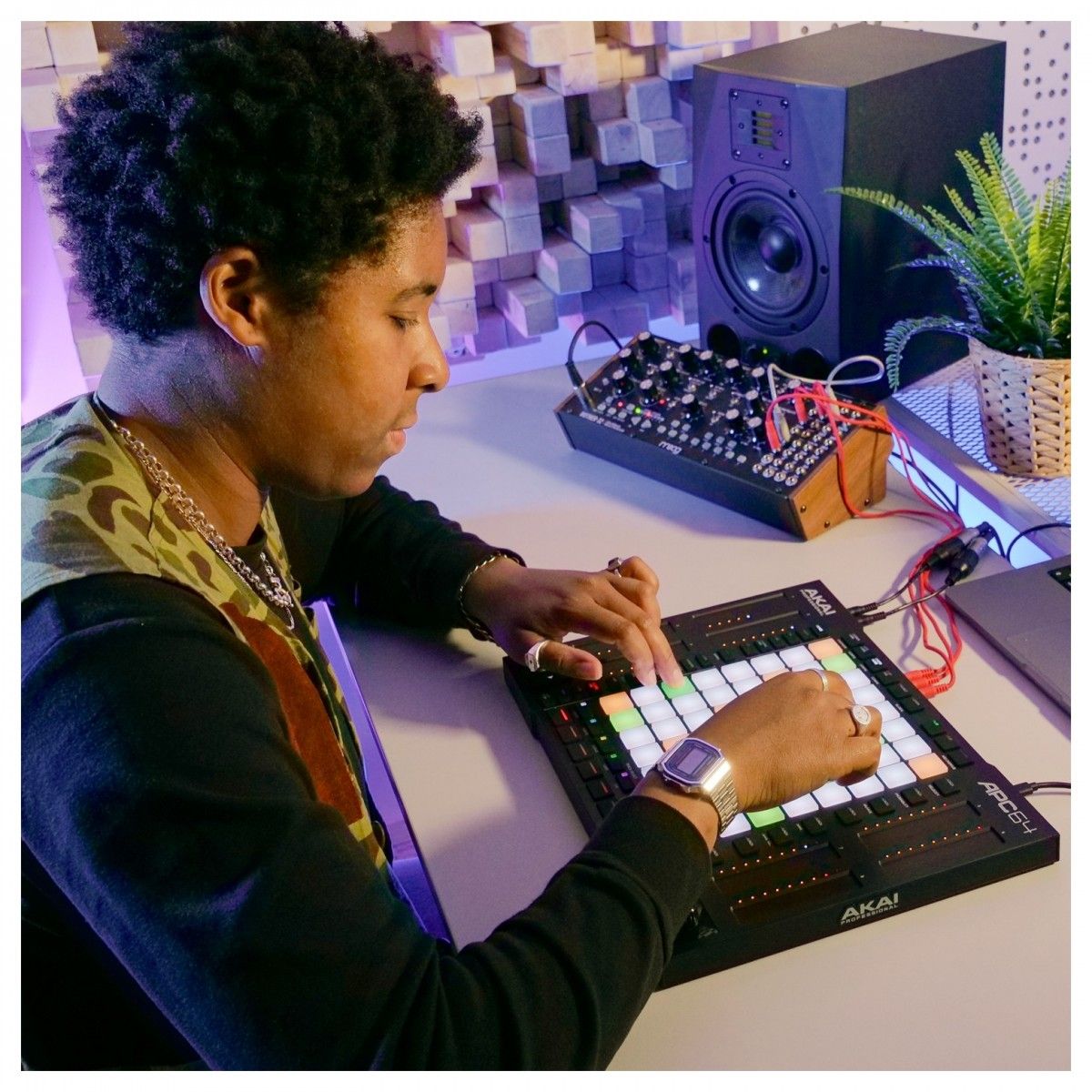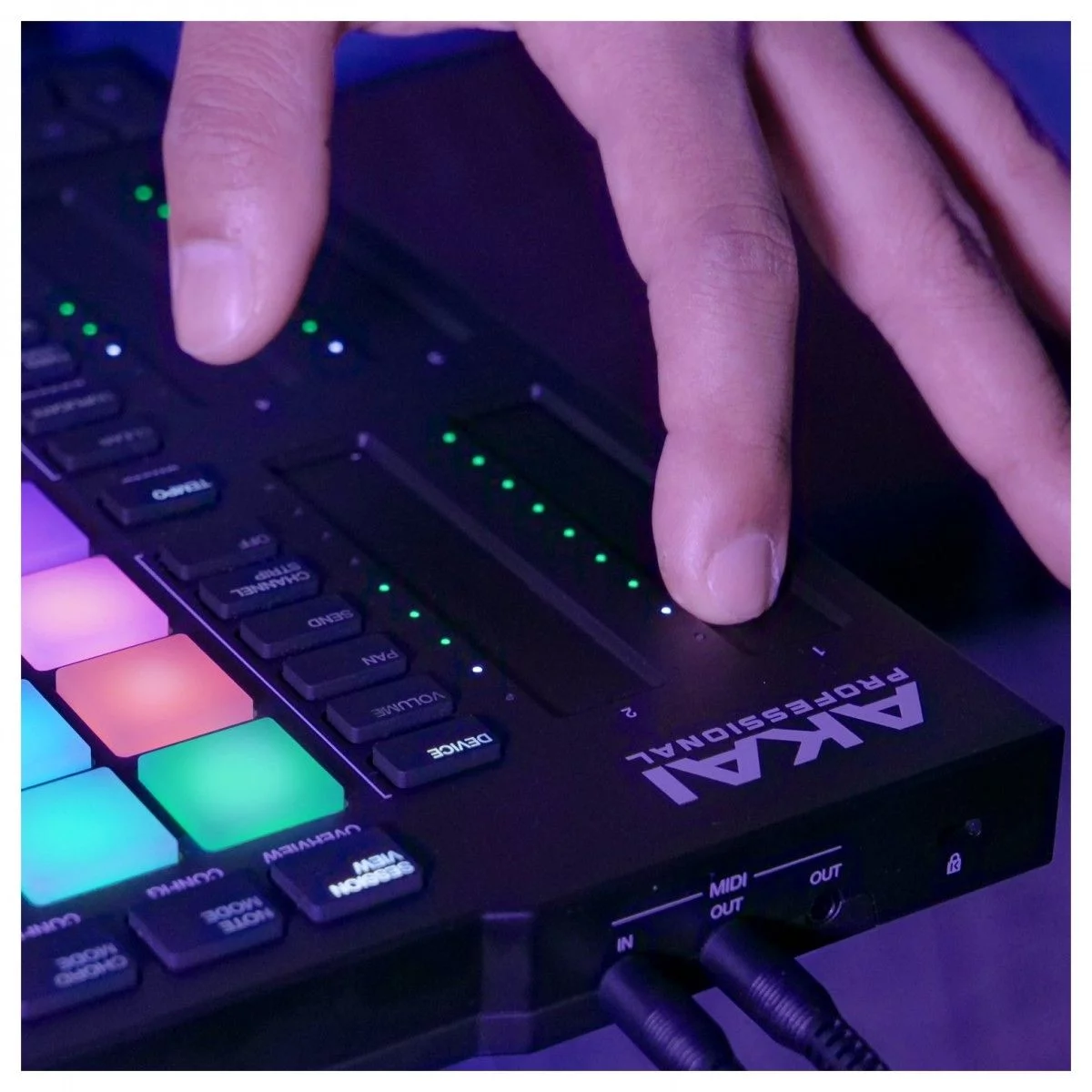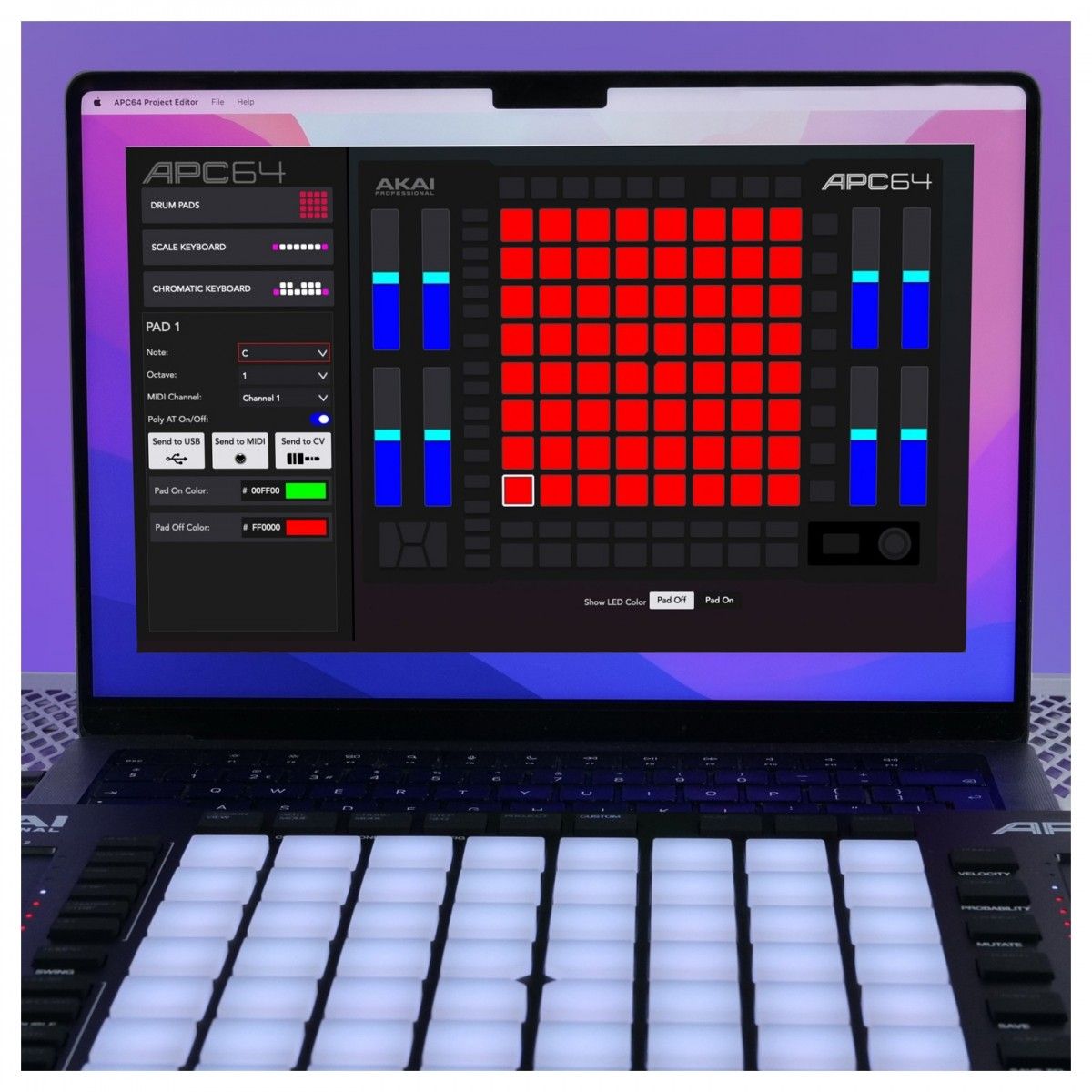 AKAI APC64 — контроллер для студийной и концертной работы с Ableton Live. Может использоваться как единый студийный хаб, который позволит управлять внешними синтами, драм-машинами и модульным оборудованием. APC64 работает как автономный 32-шаговый секвенсор на 8 каналов. Для внешнего оборудования выделено 3 MIDI-порта и 8 выходов CV/Gate. Для игры и запуска событий на передней панели находится сетка из 64 пэдов с чувствительностью к velocity, aftertouch и интерактивной подсветкой, а также 8 назначаемых сенсорных лент, которые можно использовать для управления высотой тона, модуляцией, фильтрами и прочими средствами обработки. Параметры сессии проекта отображаются на LED-дисплее в реальном времени. Предусмотрена транспортная панель, а также кнопки соло/мьютирования.