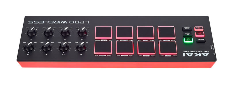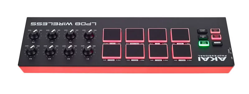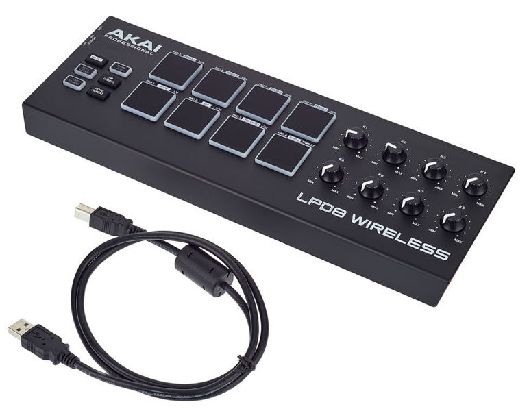 Akai Pro LPD8 WIRELESS – компактный USB/MIDI контроллер с возможностью беспроводного подключения. Это в полной мере портативная модель, имеющая небольшие габариты и вес всего 450 грамм, которую не только можно подключать к компьютеру через Bluetooth (в том числе для работы с MIDI) – она также может работать абсолютно независимо от внешних источников электропитания, от трёх батарей АА. Возможно также подключение и питание устройства через USB. Эта модель идеально подойдёт для часто выступающих музыкантов. При этом LPD8 WIRELESS – многофункциональный контроллер, обладающий широким спектром самых современных функций и возможностей. Модель оснащена восемью крупными пэдами, чувствительными к скорости нажатия, с подсветкой и восемью поворотными регуляторами с назначаемыми функциями, которыми можно настраивать любые нужные параметры. Четыре программируемых банка памяти позволяют сохранять настройки. Устройство позволяет работать в большинстве распространенных программ для редактирования аудио материала.