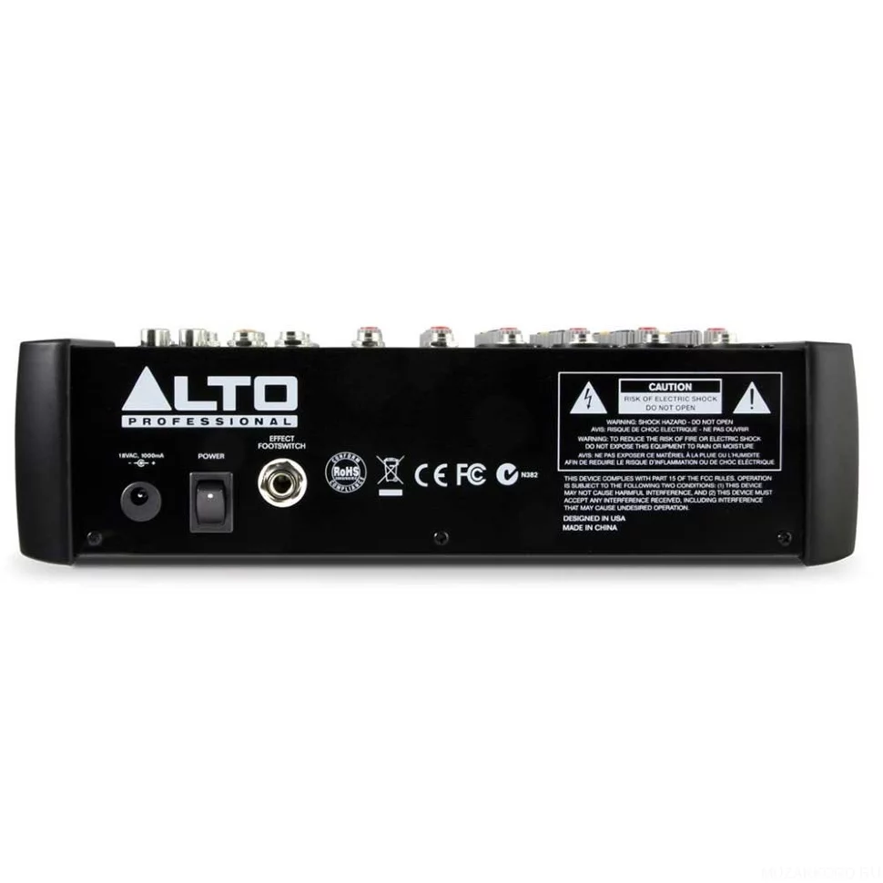 Тип устройства : микшер компактный.Спецификация : аналоговый, пассивный. Количество каналов микшера : - Общее число каналов : восемь (8) каналов;- Микрофонные каналы : четыре (4) канала (XLR);- Инструментальные моно каналы : восемь (8) каналов (1\4 TRS Jack);- Стерео каналы : две (2) стерео пары (1\4 TRS Jack).Характеристики каналов микшера : Каналы 1 – 4 : - Тип микрофонный вход, балансный, разьем XLR;- Частотные характеристики : 20 - 22000 Гц, +/-1 dB;- Хар-ки искажений : менее 0.005 проц. at + 4 (dBu), 1 (kHz);- Соотношение сигнал/шум : более 110 (dBu);- Система фантомного питания : есть (+ 48 В);- Линейные входы : балансные (1\4 Jack);- Частотные характеристики : 20 (Hz) to 22 (kHz), +/- 1 (dB);- Хар-ки искажений : менее 0.005 процентов at + 4 (dBu), 1 (kHz).Стерео каналы 5\6 и 7\8 :- Тип входов : линейный балансный вход, разьем 1\4 TRS Jack;- Соотношение сигнал/шум : более 110 (dBu);- Частотные характеристики : 20 - 22000 (Гц), +/-1 (dB);- Хар-ки искажений : менее 0.005 процент. at + 4 (dBu), 1 (kHz).Характеристики импеданса каналов микшера : - Вход микрофонный : 3.9 (кОм);- Инструментальные входы : 10 (кОм) и выше;- Выход Tape Out : 1 (кОм);- Другие выходы : 120 (Ом).Характеристика эквалайзера микшера : - Моно каналы : высокие частоты (ВЧ) ±15 дБ @ 12 кГц, средние частоты (СЧ) +/- 15 дБ @ 2.5 кГц, низкие частоты (НЧ) +/-15 дБ @ 80 Гц;- Стерео каналы : высокие частоты (ВЧ) ±15 дБ @ 12 кГц, средние частоты (СЧ) +/- 15 дБ @ 2.5 кГц, низкие частоты (НЧ) +/-15 дБ @ 80 Гц.Встроенный процессор эффектов : Alesis DSP.A/D и D/A конвертация : 24-битная.Эффекты процессора : Chorus и Flanger, Reverb модуляции (modulations), Reverb + Delay, Reverb + Chorus, Reverb + Flanger и другие.Общее количество пресетов процессора : 256 пресетов.Питание микшера : 18 Вольт, 1500 мА.Размеры микшера : (Ш) 256 мм. x (Д) 250 мм. x (В) 72 миллиметра.Вес микшера : 2,3кгПроизводитель : компания ALTO, произведено в Китае.