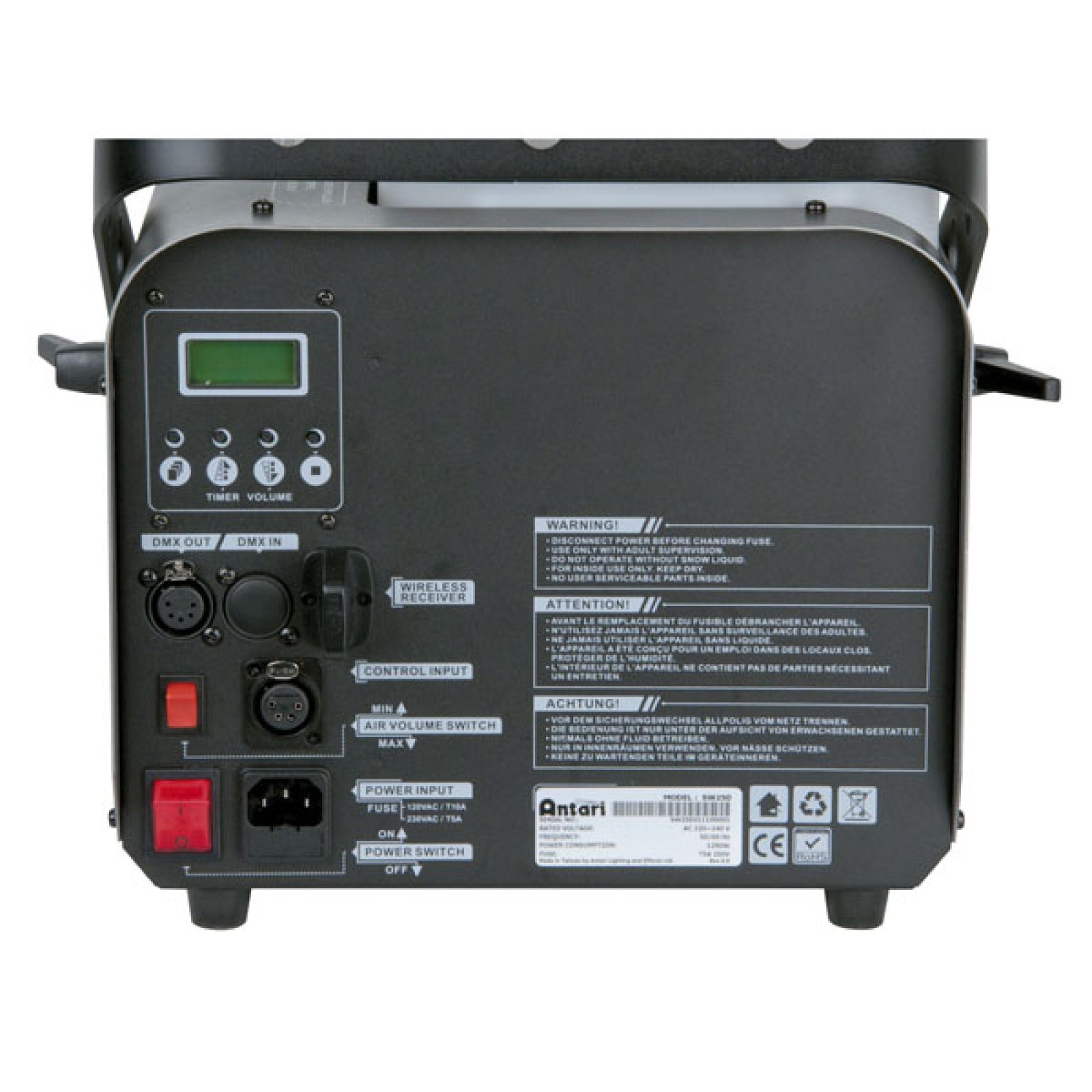 Новый генератор снега от Antari - это полностью оцифрованное управление по DMX протоколу, беспроводной пульт ДУ и увеличение производительности до 250 мл/мин, что позволяет создать эффект реальной снежной бури. Кроме того, таймер и регулировка объема(1~100%) делает более точным управление выбросом снежинок.