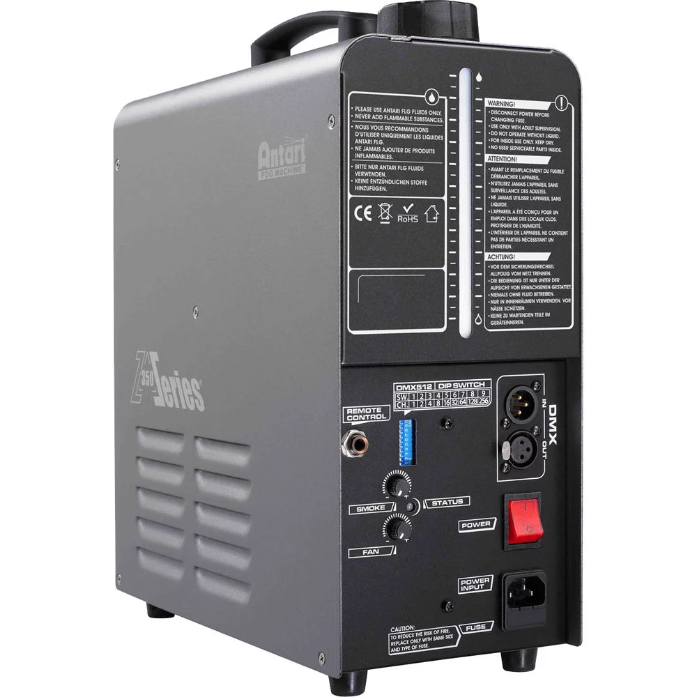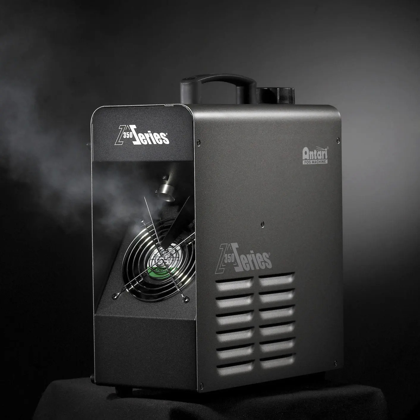 Новая модель с вертикальным расположением отличается простотой и удобством в управлении. Усовершенственная конструкция включает в себя такие новые компоненты, как алюминиевый нагреватель, тихий и экономичный насос, схемотехнику с новыми инженерными решениями и высокоточный сдвоенный вентилятор. Действие нового нагревательного элемента настолько эффективно, что машина может работать в течение 2 часов при 30%-ной нагрузке, потребляя всего 1 литр жидкости. Генератор использует обычную жидкость для дым-машин. Скорость вращения вентилятора может чутко контролироваться благодаря модулю цифрового контроля X-10 и использованию шарикоподшипникового механизма крепления оси вентилятора. Вентилятор для распыления и насос для подачи жидкости работают абсолютно бесшумно. Улучшенный встроенный интерфейс DMX позволяет пользователю разумно управлять Z-350 - при включении сигнала DMX, генератор включается и начинает автоматически нагреваться. При выключении сигнала DMX, прибор также автоматически начинает процесс самоочистки, затем переходит в спящий режим. Будучи легкой и компактной, Z-350 легко транспортируется и устанавливается в любой необходимом месте.