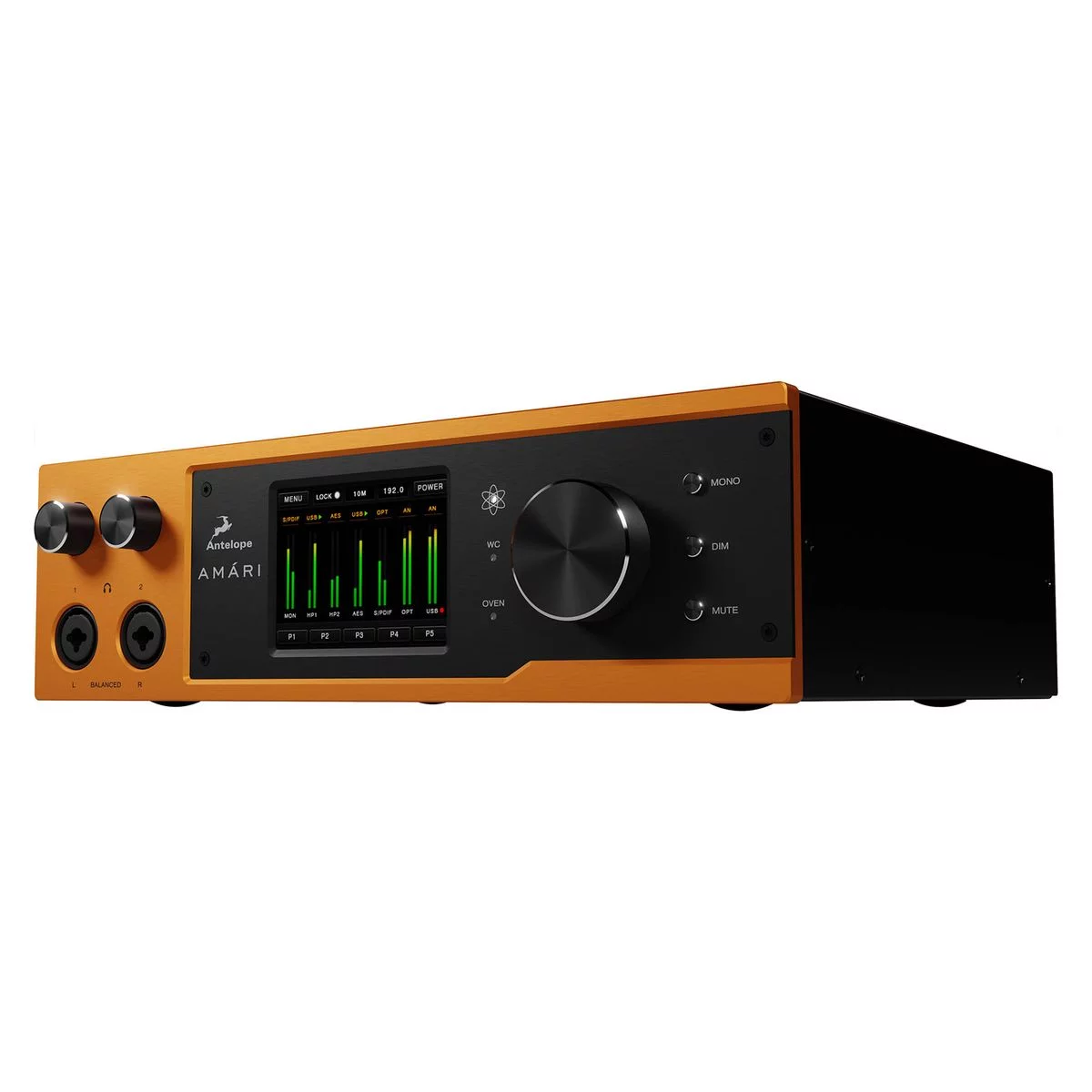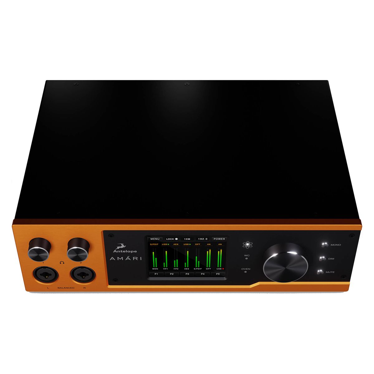 Antelope Audio Amari - флагманский USB 3.1 АЦП/ЦАП преобразователь, способный работать с частотой дискретизации до 384 кГц и поддерживающий DSD256. Аудиоинтерфейс имеет уникальную архитектуру из 8 микросхем CS43198, благодаря которой производителям удалось добиться значения динамического диапазона ЦАП в 138 дБ. Для АЦП преобразования применены два чипа AK5578 с динамическим диапазоном 128 дБ. В Amari используется фирменная 64-х битная технология тактирования сигнала Acoustically Focused Clocking и новый алгоритм для подавления джиттера.