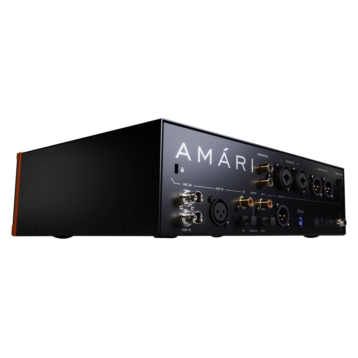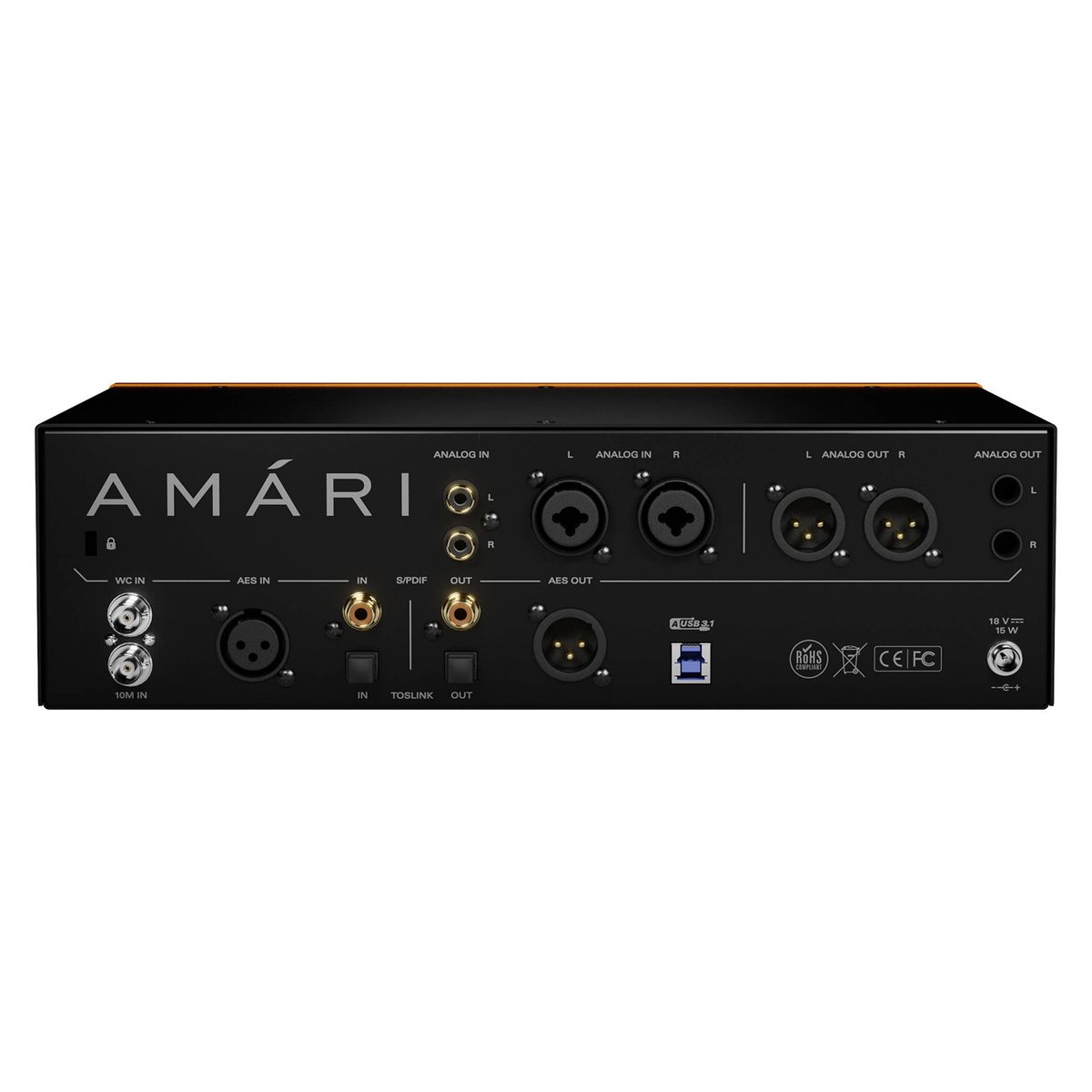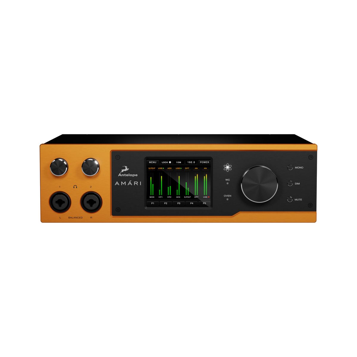 Интерфейс оснащен двумя выходами для наушников с регулируемым сопротивлением и независимыми усилителями. На передней панели находится сенсорный дисплей, регуляторы громкости наушников, общая ручка усиления и кнопки Mono/Din/Mute. Для коммутации Amari предусмотрены следующие входы и выходы: 2 TRS L/R выхода, 2 XLR L/R выхода, 2 XLR/TRS входа, 2 RCA входа, AES IN/OUT, S/PDIF вход и выход, TOSLINK IN/OUT, два выхода для наушников, входы Word/Atomic Clock, порт USB.