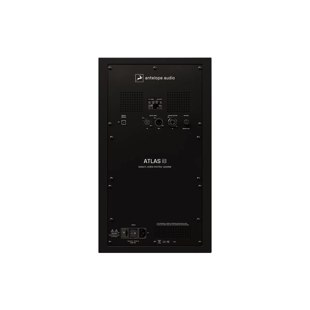 Antelope Audio Atlas i8 - 8" 3-полосный активный студийный монитор. Модель оснащена двумя 8” НЧ динамиками, расположенными внутри корпуса друг за другом. Благодаря этой конструкции, сохраняется общий размер монитора, но при этом обеспечивается эффективный частотный диапазон. В свою очередь, СЧ и ВЧ воспроизводятся с помощью коаксиального излучателя, позволяющего устанавливать монитор как горизонтально, так и вертикально без риска возникновения гребенчатой фильтрации или провалов в спектре ВЧ. Мониторы также могут похвастать усилителем класса D с суммарной мощностью 400 Вт (разработанным специально для Atlas i8) имеющим низкий уровень искажений. Задняя сторона модели оснащается цветным дисплеем (для ручной настройки), открывающим доступ к четырёхполосному эквалайзеру. Кроме этого, через дисплей можно настроить задержку, отрегулировать громкость, а также задействовать такие функции как MUTE и DIM с помощью программного обеспечения. Коммутационные возможности Atlas i8 включают комбо-вход на разъёме XLR/TRS, разъёмы входа/выхода AES/EBU и порт USB.