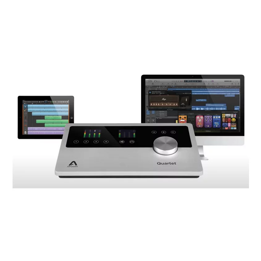 Apogee представляет Quartet для iPad и Mac, USB-аудиоинтерфейс с 4 входами и 8 выходами. Quartet представляет собой первый в мире профессиональный многоканальный аудиоинтерфейс, поддерживающий возможность непосредственного обмена цифровыми аудиоданными между Apple iPad (iPhone, iPod) и Mac. Quartet работает на основе управляющего программного обеспечения Apogee Maestro, поддерживает зарядку устройств iOS, MIDI-коммутацию, расширенное управление мониторингом и обеспечивает профессиональное качество звука. Quartet является идеальным студийным центром управления для записи и микширования многоканальной музыки с помощью iPad и Mac.
