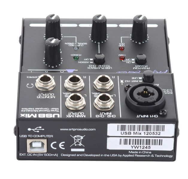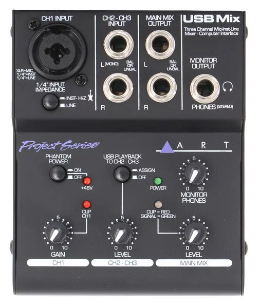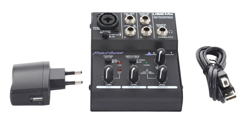 Компактный, помещающийся в руке, микшер на 3 входа со встроенным USB интерфейсом.