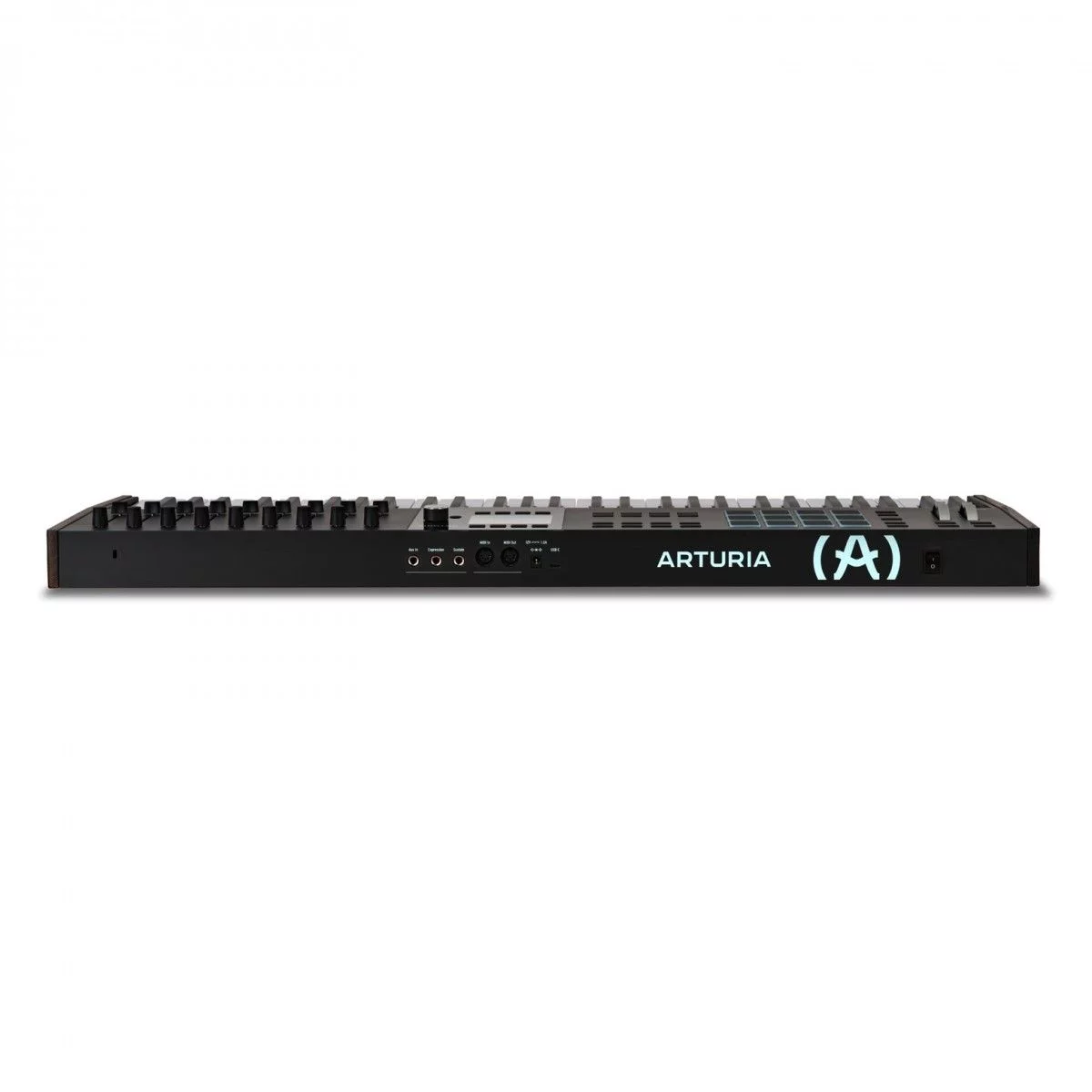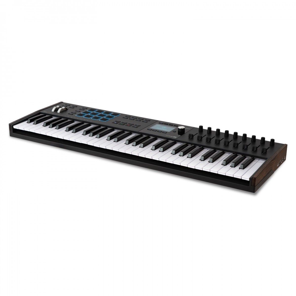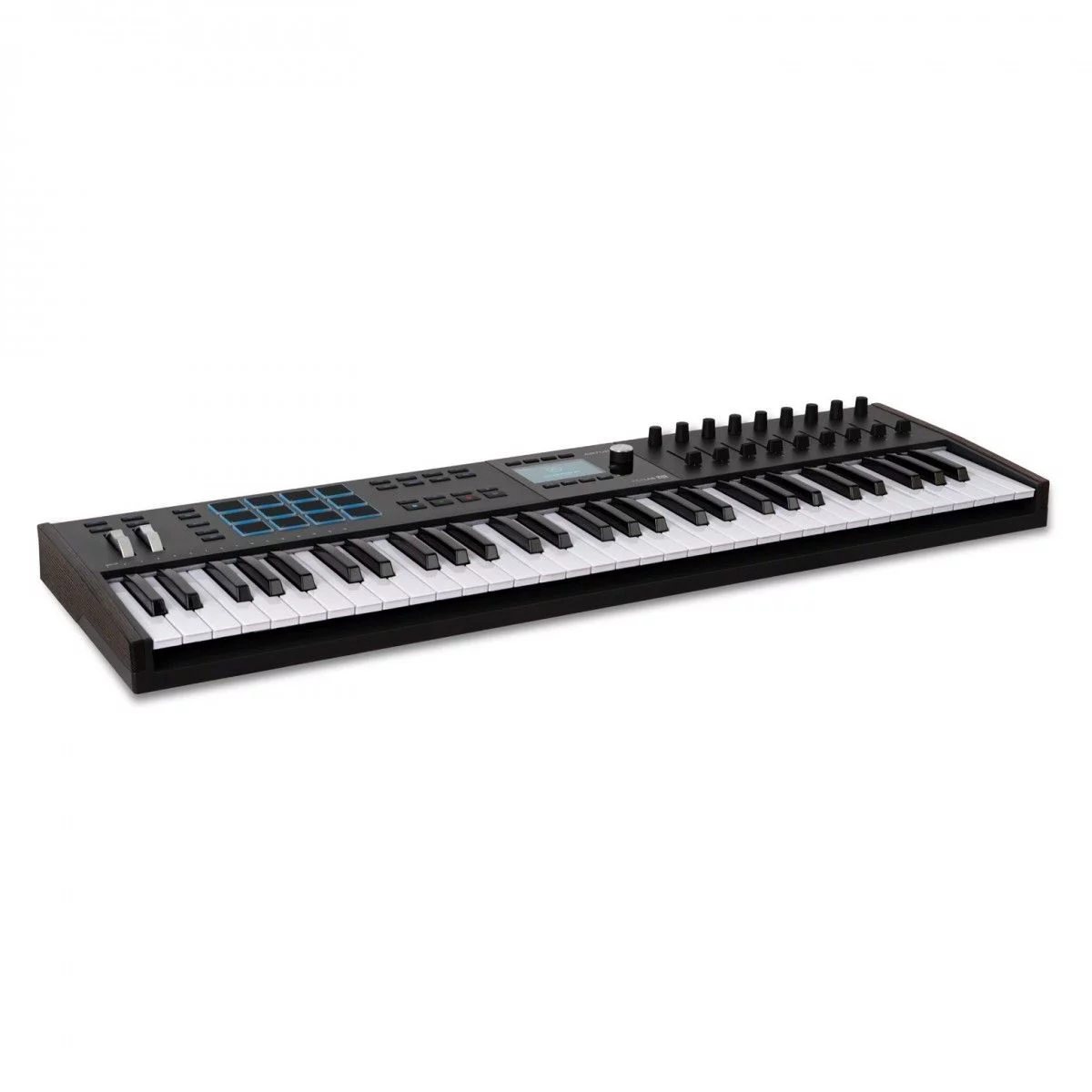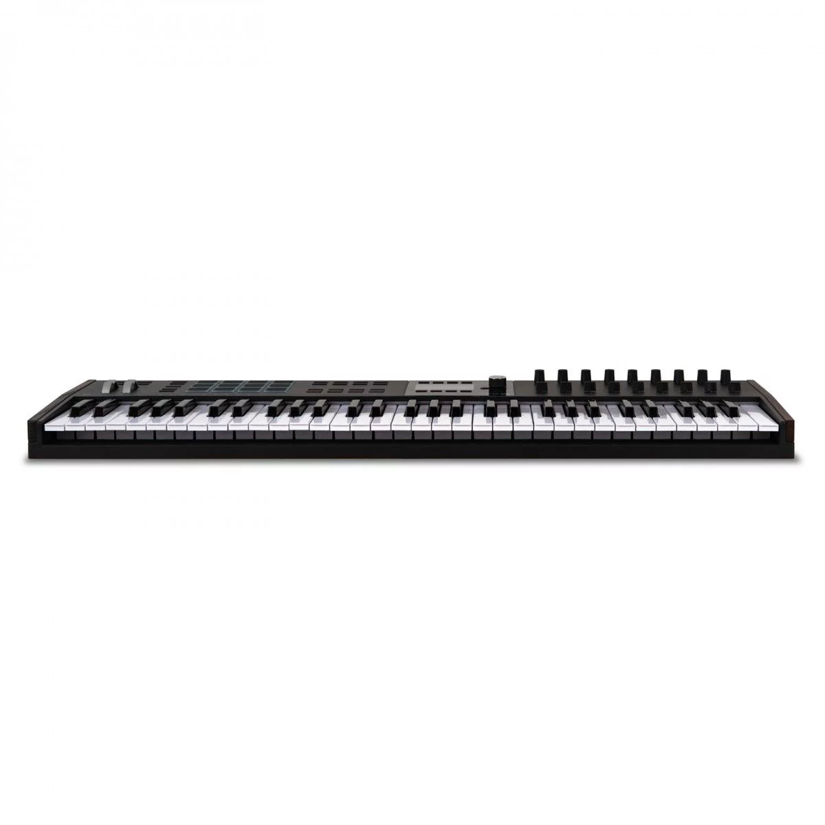 MIDI клавиатура, 61 клавиша, полувзвешенная механика, дисплей, 12 пэдов , 9 фейдеров, 9 поворотных регуляторов, 3 входа для подключения педалей, MIDI in/ out, USB-C