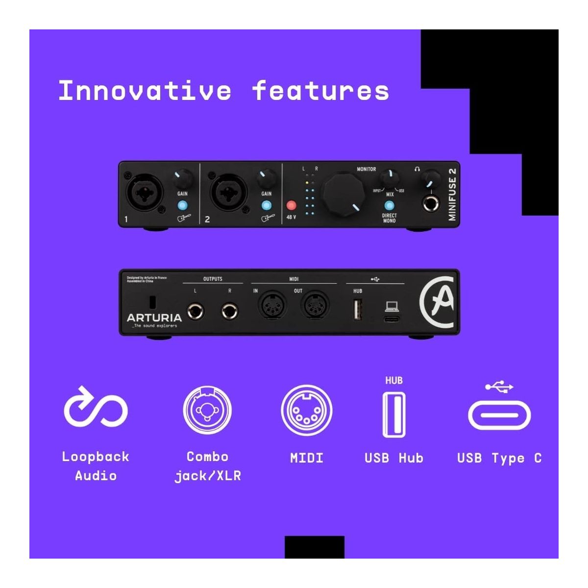 С помощью приложения MiniFuse Control Center вы можете отслеживать его входы, выходы, настройки и обновления прошивки в одном месте. Интерфейс работает от шины USB-C. Интерфейс имеет виртуальный канал обратной связи, который отлично подходит для записи телефонных звонков или игрового звука. В комплекте также поставляется пакет ПО, включающий Ableton Live Lite, Arturia Analog Lab Intro, Arturia FX, Native Instruments Guitar Rig 6 LE и бесплатную трехмесячную подписку на Auto-Tune Unlimited и Splice.