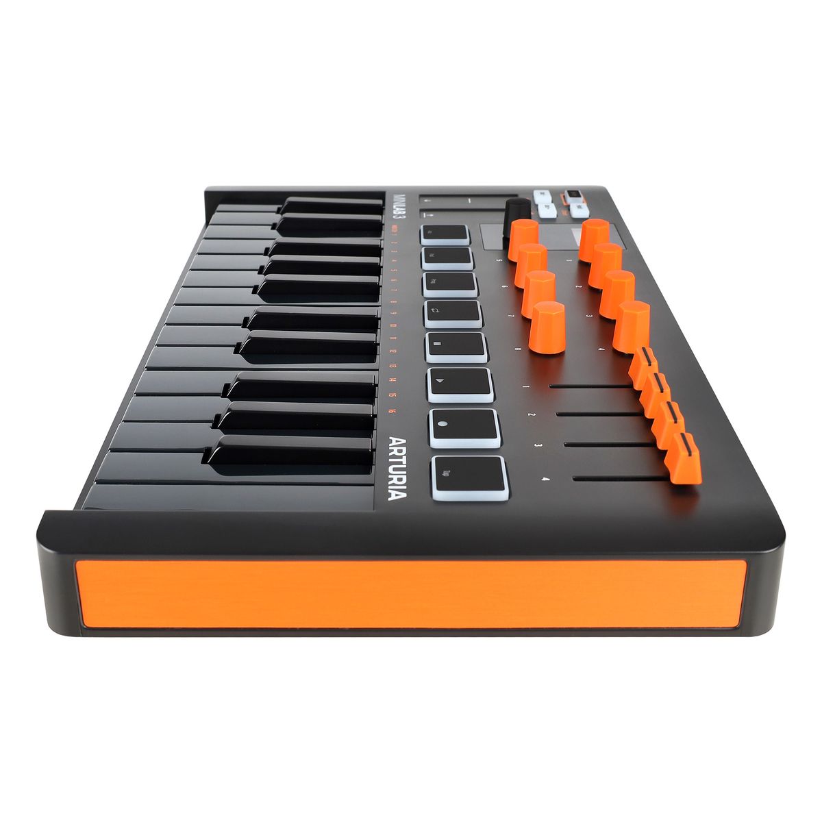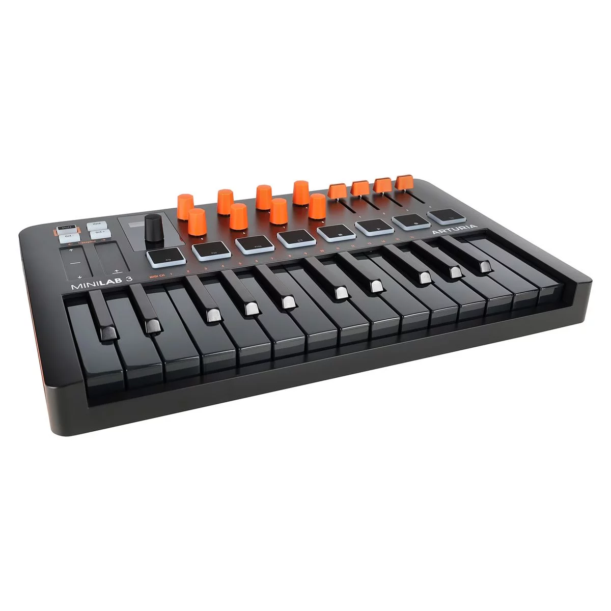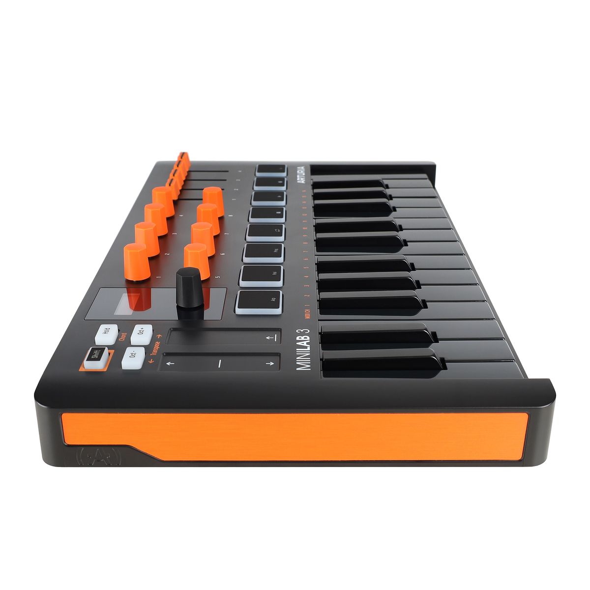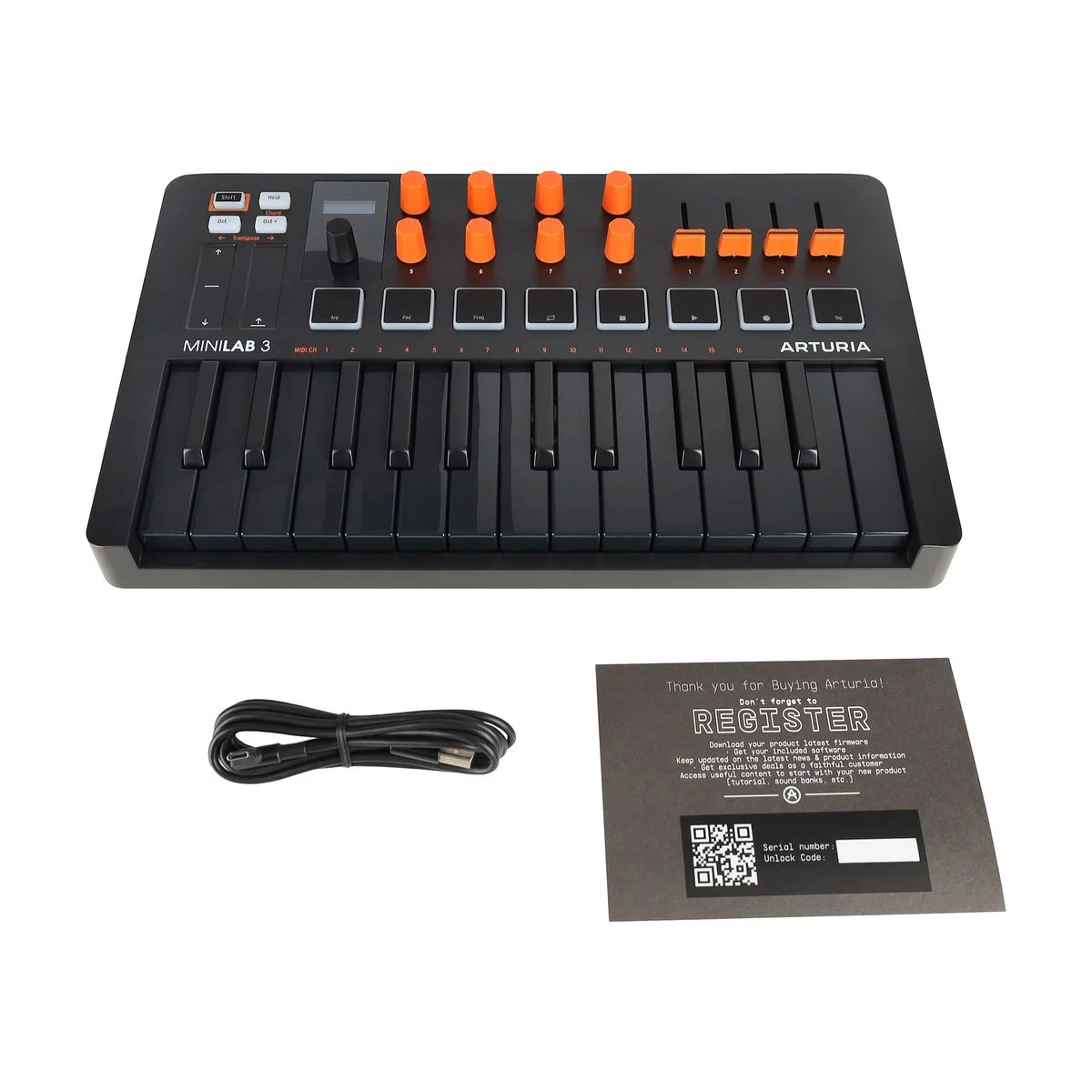 Arturia MiniLAB 3 Orange Edition - компактная миди-клавиатура с пэдами, лимитированное издание в полностью черном цвете с оранжевыми ручками. Благодаря возможности подключения к компьютеру в режиме plug-and-play, универсальным назначаемым элементам управления, набору из 500 звуков из обширной библиотеки Analog Lab и комплекту творческого ПО мирового класса, MiniLAB 3 поможет новичкам и профессионалам по-настоящему погрузиться в процесс создания музыки, независимо от их стиля. От великолепной на ощупь клавиатуры, интеллектуальных пэдов и фейдеров, интегрированных в DAW, до мини-дисплея в реальном времени - каждый аспект MiniLAB 3 разработан, чтобы быть интуитивно понятным, экспрессивным и приятным в использовании. Наслаждайтесь процессом работы, который способствует развитию творческого потенциала, благодаря таким функциям, как встроенный арпеджиатор, режим Chord, пользовательские пресеты DAW и легкая транспозиция. MiniLAB 3 создан для того, чтобы органично вписаться в любой сетап - от спальни до сцены, благодаря компактному и легкому корпусу, более глубокой интеграции с DAW, а также возможности подключения MIDI-выхода и USB-C. Прочная конструкция, готовая к использованию в дорожных условиях, 5-летняя гарантия, состав из минимум 50% переработанного пластика и 100% переработанная упаковка означают, что этот контроллер будет работать долго. Помимо технологичного MIDI-контроллера, пользователи получают полный комплект первоклассного ПО для создания музыки, включая такие инструменты премиум-класса, как Ableton Live Lite, Analog Lab Intro, рояль UVI Model D и пианино Native Instruments "The Gentleman". Также имеется доступ к миллионам бесплатных лупов и сэмплов с подпиской Loopcloud на 2 месяца + 1 приветственный пакет + 1 пакет на выбор, а также "неограниченная" пробная подписка и бонусные уроки Melodics.