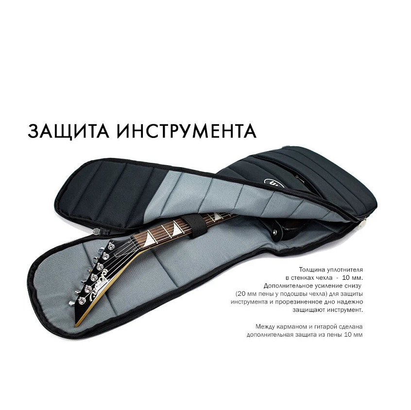 2. Чехол оснащён большим внешний карман на молнии. Между карманом и гитарой сделана дополнительня защита из пены 10 мм, оборудование и вещи не будут повреждать корпус гитары.