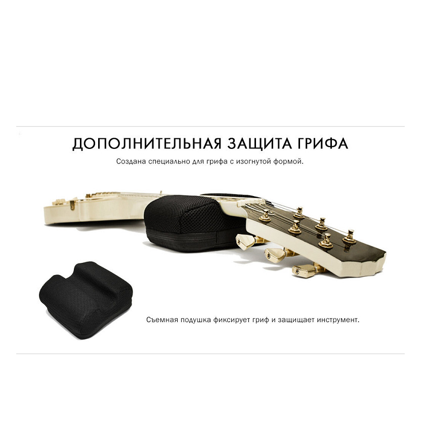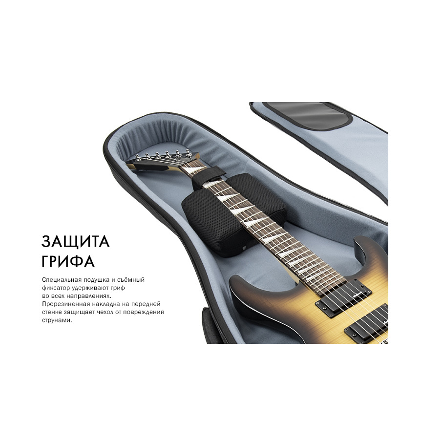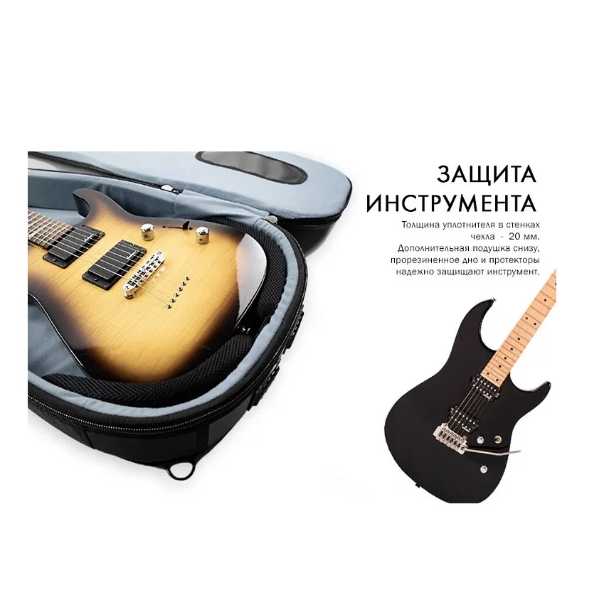 "Чехол универсальный, предназначен для хранения и переноса электрогитар различной формы (Stratocaster, Les Paul, Telecaster, др.).