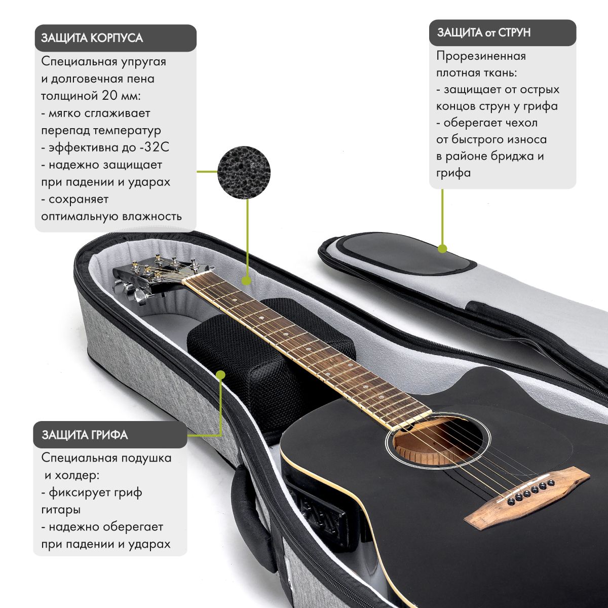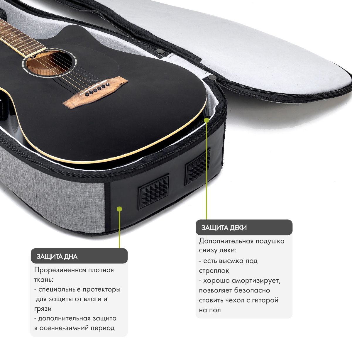 Чехол для акустической гитары универсальный. Подходит практически для всех размеров акустических гитар, кроме самых крупных (суперджамбо, 12-струнных).