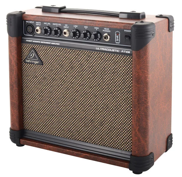 ULTRACOUSTIC AT108 – небольшой универсальный инструментальный усилитель с раздельными каналами для подключения собственно музыкального инструмента и микрофона. В роли микрофонного входа выступает XLR разъём; инструмент подключается к монофоническому ?-дюймовому TS гнезду. Уровень входного сигнала для них выставляется отдельно. Кроме того, на микрофонный и инструментальный сигнал можно наложить аудио с CD-плеера, который подсоединяется через 1/4-дюймовый стереофонический TRS вход.
