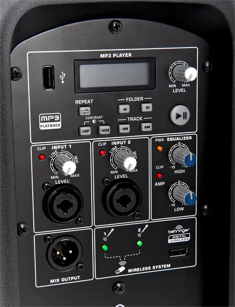 B112MP3 обладает 1000 Вт усилителем класса D, запатентованным процессором DSP с двух-полосным эквалайзером, активным кроссовером, лимитером с двойной защитой и корректированием, гарантирующие очень низкий уровень искажения. Специально разработанные динамики LF и НF обеспечивают мощное сбалансированное звучание с массивным басом, детальном середином и чистым верхом.