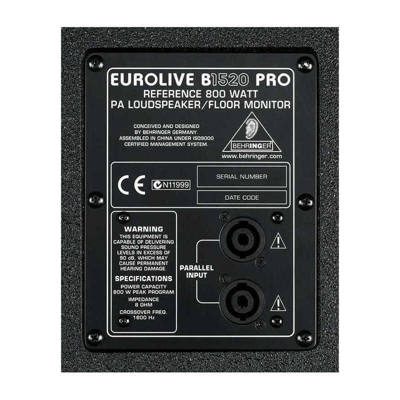 EuroLive B1520 PRO – широкополосная колонка, которую одинаково удобно использовать в качестве единственного динамика для небольшого, рассчитанного на несколько десятков человек помещения и в качестве элемента крупной аудиосистемы или кластера. Её номинальная мощность составляет 800 Вт, пиковая же может достигать 1200 Вт; этот запас позволяет не беспокоиться о возможных перегрузках. Твиттер же дополнительно защищён от них встроенным лимитером. Максимальное звуковое давление, создаваемое динамиком, равняется 96 дБ SPL.