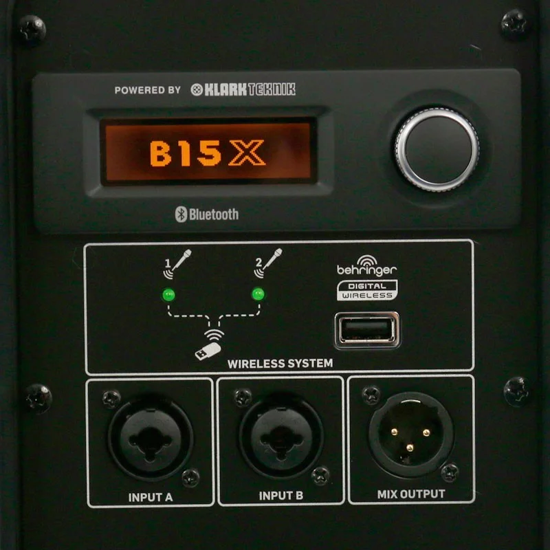 BEHRINGER B15X имеет двухполосную конструкцию, встроенный усилитель 1000 Вт, 24-битный DSP процессор от Klark Teknik, на борту акустической системы 3-канальный цифровой микшер с двумя входами XLR-1/4" и порт USB, к которому можно подключить приёмник беспроводной системы ULM-серии.