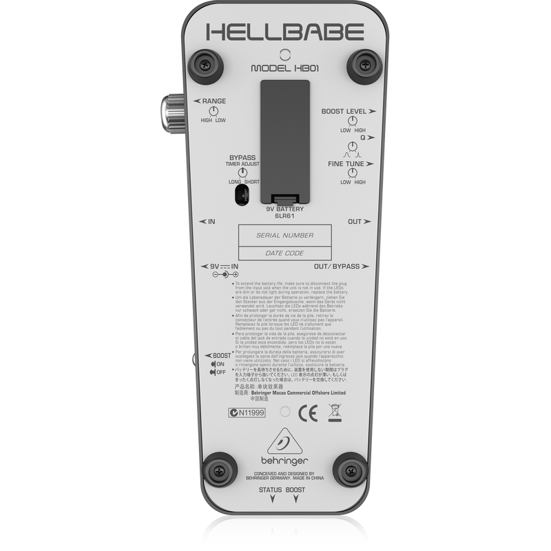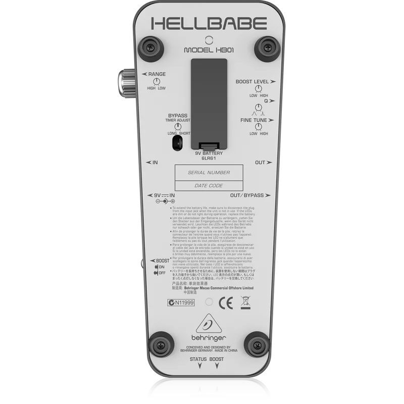 Предлагая настройку "Heel Down"-частоты в диапазоне от 440 Гц до 250 Гц, педаль одинаково привлекательная как для гитаристов, так и для басистов. Дополнительный регулятор точной настройки (Fine Tune) управляет амплитудой для получения бриллиантового, выразительного тембра, а регулятор Q для точной настройки огибающей фильтра управляет характером звучания и позволяет получить эффект вокодера. Регулируемая функция усиления с выключателем поможет "раскачать" звук, делая соло и рифы еще более выразительными. В конструкции «квакушки» были использованы сверхмалошумящие элементы, гарантирующие превосходное звучание. На боковой панели расположились светодиодные индикаторы Effect On/Off и Boost On/Off. Питание осуществляется от батареи 9 В или сетевого адаптера (в комплект поставки не входит). Этот продукт BEHRINGER был разработан как прямой конкурент ведущим изделиям на рынке.