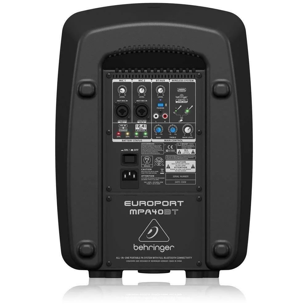 BEHRINGER MPA40BT представляет собой компактную систему звукоусиления с встроенным микшером. Мощность системы составляет 40 Вт. Встроенный микшер имеет 2 канала, в которые можно подключить микрофон или источник линейного сигнала. Несмотря на свои компактные размеры, система звукоусиления BEHRINGER MPA40BT имеет достаточно функций для использования ее на презентация, небольших шоу-программах, деловых встречах и пр. Для коммутации используются комбинированные разъёмы XLR/TRS. Есть разъёмы CD/Tape и дополнительный AUX вход. Так, можно воспроизводить музыку с USB накопителя или мобильного устройства. Есть система эквализации звукового сигнала, система защиты звуковых излучателей от перегрузок и перегорания. Система имеет ручку и транспортировочные колёса. Есть Bluetooth и USB-порт для подключения радиосистем. Также возможно питание всей системы от батарей.