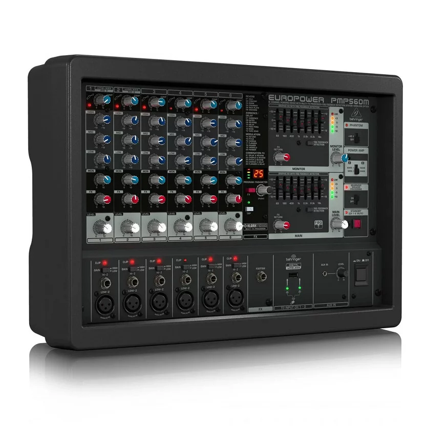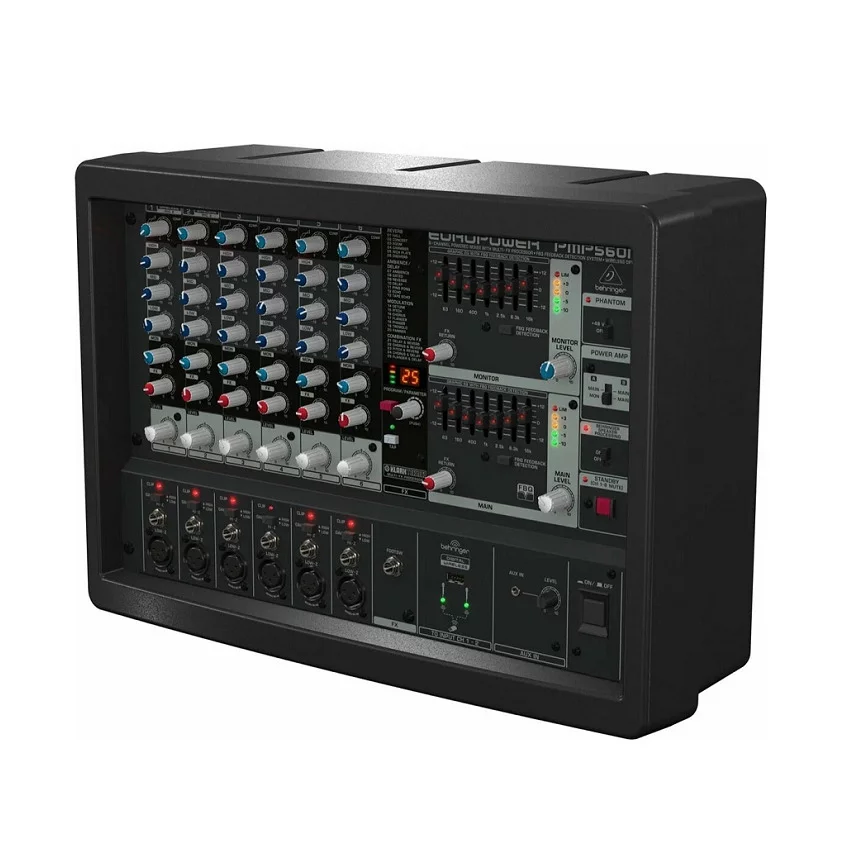 Входной сигнал подаётся на 6 монофонических каналов микшера или же на AUX вход. Каждый канал оборудован отдельным трёхполосным эквалайзером с отключаемым Pad и индикатором клиппирования, позволяющим отследить превышения допустимой интенсивности сигнала. Линейные входы способны функционировать в режиме Hi-Z, в котором к микшеру возможно напрямую подключить электрогитару или другой монофонический музыкальный инструмент. Кроме того, к каналам прикреплены микрофонные разъёмы с предусилителями IMP и отключаемым фантомным питанием, благодаря которому EUROPOWER PMP560M совместим и с конденсаторными, и с динамическими микрофонами. Беспроводные микрофоны для EUROPOWER PMP560M также не проблема – достаточно подключить в специальный разъём wireless-адаптер.