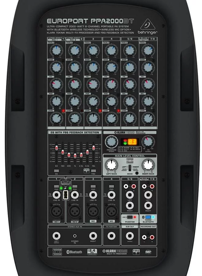 Портативная система звукоусиления BEHRINGER EUROPORT PPA2000BT, несмотря на свои скромные размеры, генерирует достаточно мощный и качественный звук. Набор очень прост в монтаже и его установка занимает считанные минуты. Система очень коммуникабельна. К ней можно подключить четыре микрофона, МР3-проигрываетль и два инструмента. Это отличное решение для проведения корпоративов, вечеринок, семинаров и небольших тожественных мероприятий.