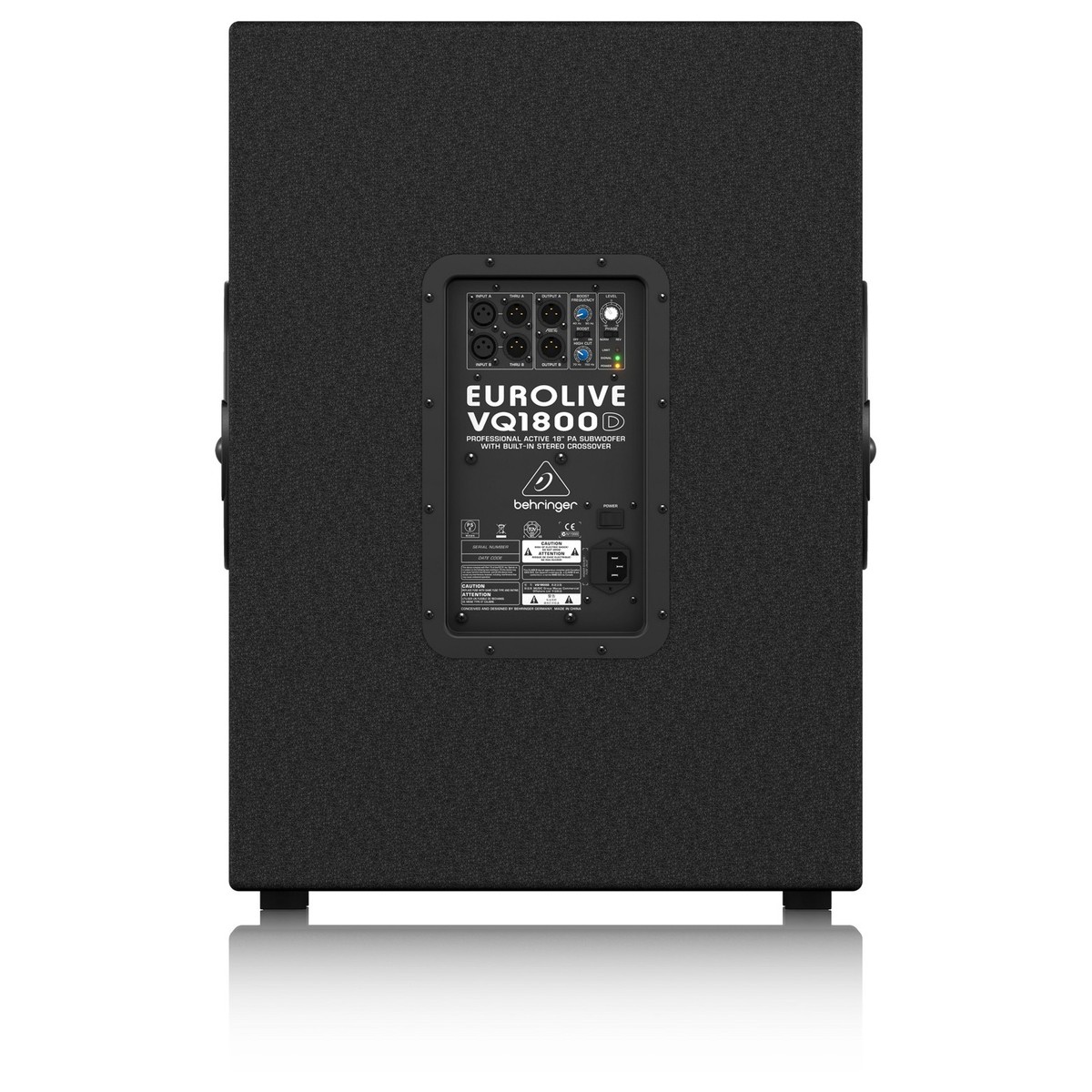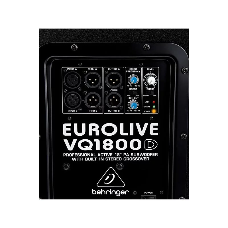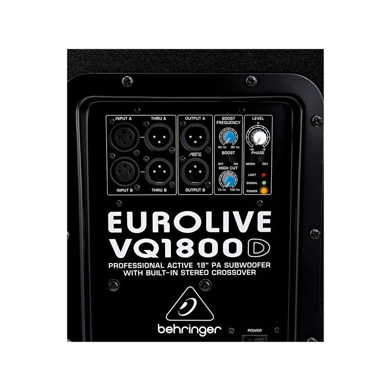 VQ1800D характеризуется сбалансированными XLR входами и выходами, а также сбалансированными джеками XLR Thru для подключения дополнительных систем. Ручка повышения частоты (Boost Frequency) предназначена для регулировки частоты между 40 Гц и 90 Гц. Можно добавить выбранной частоте 6 дБ одним щелчком переключателя Boost. Также сабвуфер имеет регулятор высоких частот для управления высокими частотами между 70 и 150 Гц, который не затрагивает Thru или выходные сигналы, а только сигналы направленные непосредственно на сабвуфер. Светодиоды отображают рабочее состояние, в том числе питания, наличие сигнала и перегруз.
