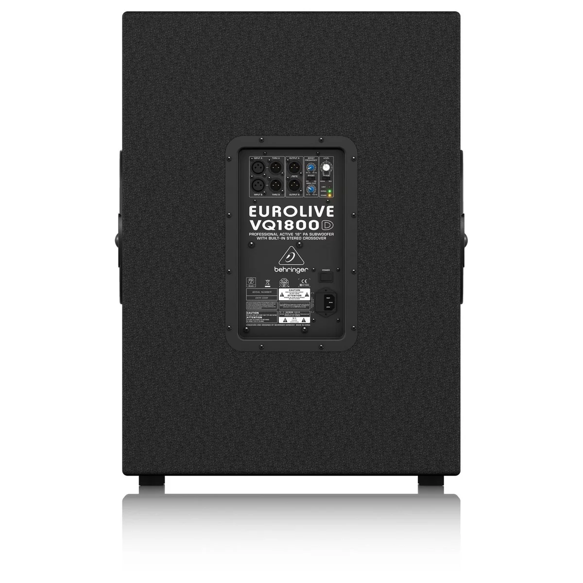 Behringer VQ1800D - профессиональный активный сабвуфер со встроенным кроссовером мощностью 500 Вт. VQ1800D идеальный сабвуфер для превосходного дополнения к ди-джей и клубному оборудованию. Оборудованный невероятным множеством профессиональных характеристик, эта маленькая машина обеспечит мощным ударным басом с четкостью и ясностью, типичных для больших систем.