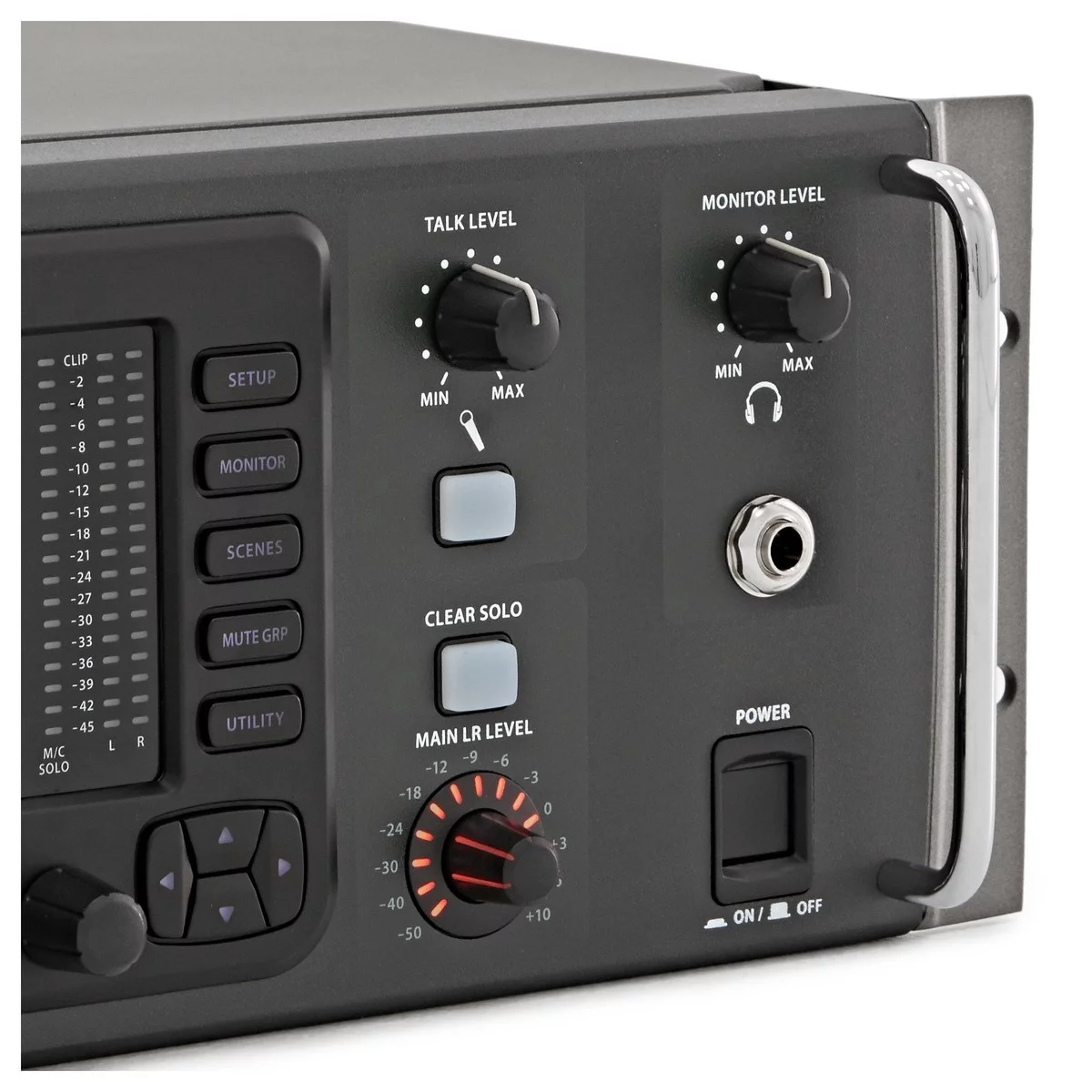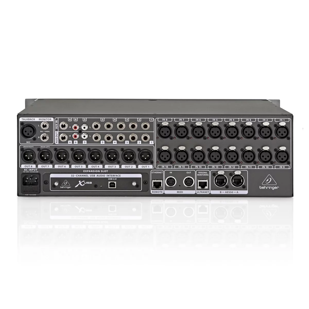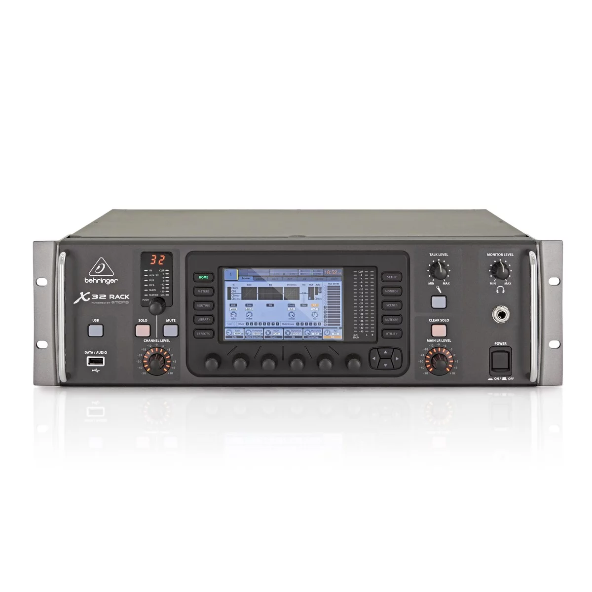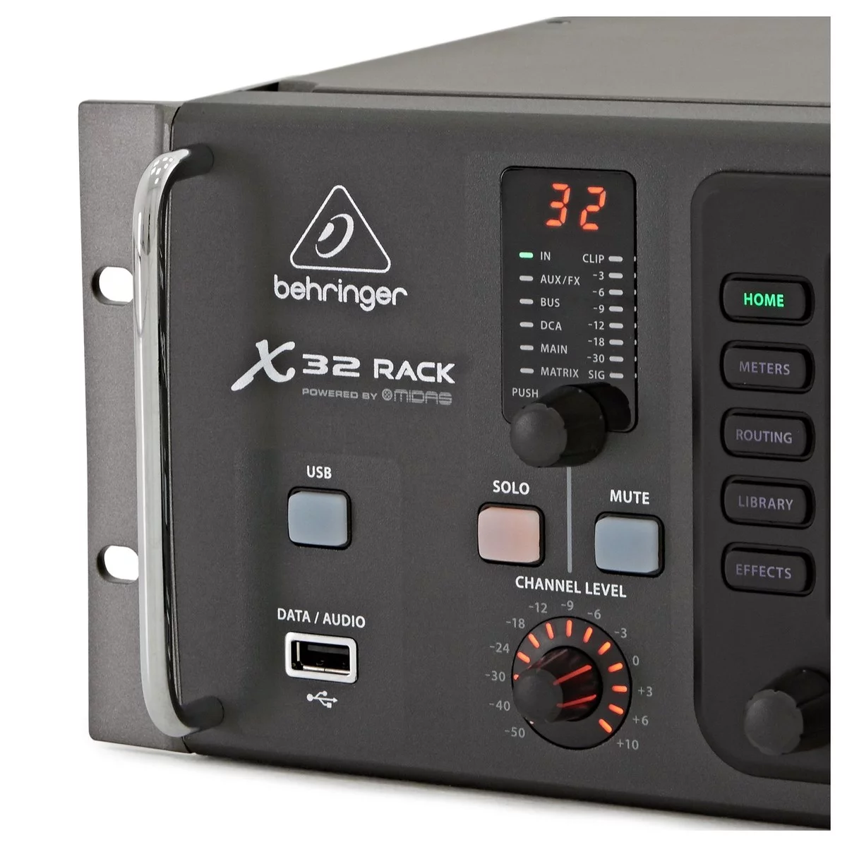 В рэковой стойке DIGITAL MIXER X32 RACK занимает 3 unit-секции. Крепление и ручки для транспортировки сделаны из металла, что повышает надёжность конструкции. Все разъёмы, за исключением гнезда для наушников, находятся на задней стенке корпуса. Входная секция представлена 16 разъёмами XLR-типа с встроенными и полностью программируемыми микрофонными предусилителями MIDAS, 6 линейными входами и микрофонным разъёмом для организации работы Talkback. Для передачи сигнала другой аудиоаппаратуре предусмотрено 8 XLR и 6 линейных выходов.