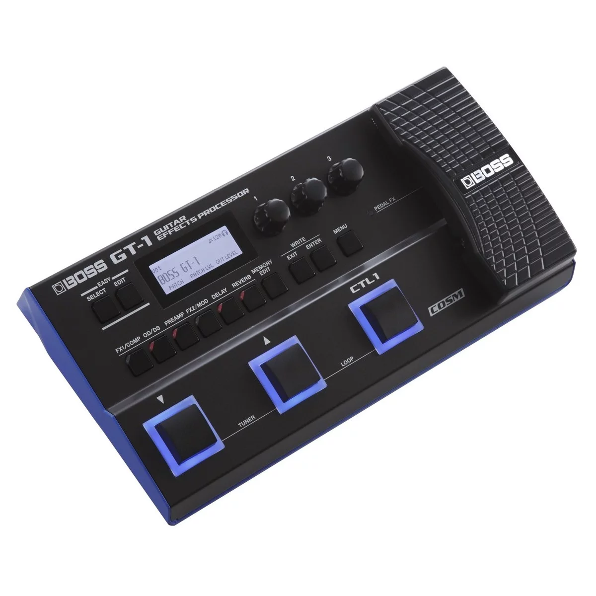 Три не занимающих много места ножных переключателя позволяют оперативно выбирать патчи, включать тюнер, управлять зацикливанием и производить другие действия. Переключатель CTL1 можно назначить на настукивание темпа, включение/выключение эффектов и на управление другими функциями. Педаль экспрессии и ее переключатель назначены на управление громкостью, эффектом вау и другими параметрами эффектов. Предусмотрен даже разъем, позволяющий расширить потенциальные возможности управления за счет подключения двух внешних ножных переключателей или педали экспрессии. Кроме доступа к BOSS Tone Central и BOSS Tone Studio, в GT-1 предусмотрен порт USB для записи и реампинга тембров с помощью компьютерного приложения DAW.