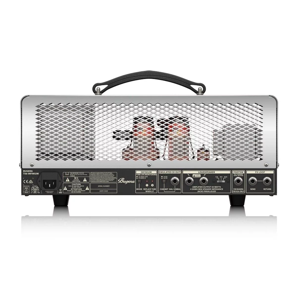Ламповый усилитель для электрогитары Bugera T50-INFINIUM развивает довольно высокую мощность и может работать в различных режимах, обеспечивающих различный по характеру звук. Аппарат выполнен в узнаваемом корпусе, дизайн которого соответствует классическим моделям данного класса, выпускаемым в 60-е годы прошлого века. Усилитель оснащен двухканальным предусилителем, обеспечивающим звучание Clean и Lead. В каждом из каналов, построенных на лампах 12AX7, предусмотрены регулировки тембра по трем полосам (НЧ, СЧ, ВЧ), усиления, а в канале Lead имеется и регулятор громкости. В мастер-секции Bugera T50-INFINIUM предусмотрены эффект реверберации, настраиваемый фильтр и общая регулировка громкости. Дополнительно с помощью кнопки Phat можно включить режим бустера одновременно для обоих каналов. К усилителю можно подключить фирменную педаль управления, которая позволит переключать каналы и задействовать режим реверберации и внешний блок эффектов. Также аппарат имеет два разъема для подсоединяя акустических систем, включенных параллельно - поэтому при подключении пары колонок необходимо убедиться в том, что их суммарное сопротивление не ниже 4 Ом. Имеется селектор, который необходимо установить в правильное положение в соответствии с импедансом используемых колонок. Bugera T50-INFINIUM оснащен дополнительным выходом Emulated DI Out, сигнал с которого можно подать на устройство записи или микшер, который эмулирует звучание АС 1х13 или 4х12. Этот выход работает, даже когда усилитель находится в режиме Standby, а на его сигнал не влияют регуляторы громкости и фильтра в мастер-секции. Выходные каскады Bugera T50-INFINIUM могут работать в классах A или A/B (выбирается с помощью переключателя на задней панели), что позволяет получить более гладкое, или, напротив, агрессивное звучание. Режимы работы ламп контролирует фирменная система INFINIUM, которая не только подскажет, когда придет время их замены, но и автоматически настроит параметры для максимального продления срока службы (или после установки новых ламп). Технология INFINIUM Tube Life Multiplier продлевает полезный жизненный цикл ламп усилителя в 20 раз, экономя ваши деньги и гарантируя целостность тона. Эта революционная схема автоматически и постоянно контролирует работу каждой выходной лампы и равномерно распределяет нагрузку, также она компенсирует эффект старения, автоматически регулируя уровень текущего тока даже когда АС напряжение падает ниже номинального уровня. Подобная технология используется в автомобилях с полным приводом, где система распределяет нагрузку на каждое колесо для улучшения тяги. Кроме того, эта технология позволяет легко и быстро заменить испорченную лампу, так как около каждой лампы размещен светодиод, который загорается когда срок службы лампы подходит к концу.
