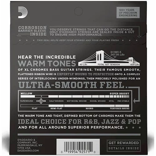 Хромирование обеспечивает глубокое, богатое звучание в самом низу диапазона, благодаря которому эти струны являются хорошим выбором для исполнителей в стилях джазовой, R&B и поп-музыки.