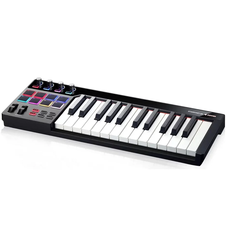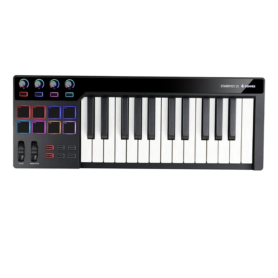 DONNER D-25 - это многофункциональная MIDI-клавиатура, которую вы можете использовать для создания собственной музыки, подключив компьютер или планшет с помощью USB-кабеля. Портативная клавиатура в стиле фортепиано, чувствительная к скорости нажатия, позволяет легко сочинять вашу уникальную музыку, как только вас посетит вдохновение. А Функции сдвига полутонов и октав позволяют получить доступ к тому же диапазону, что и на полноразмерной клавиатуре.