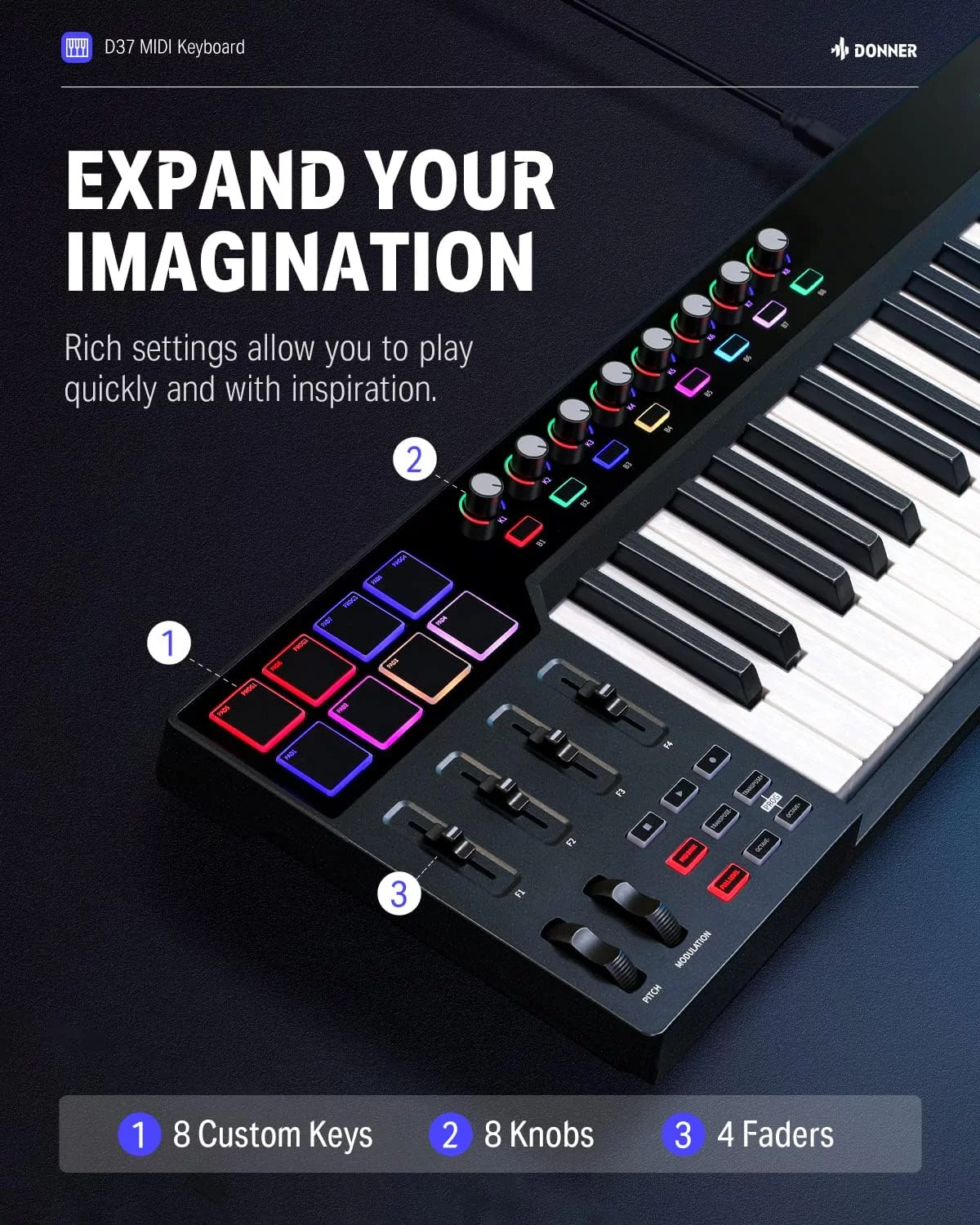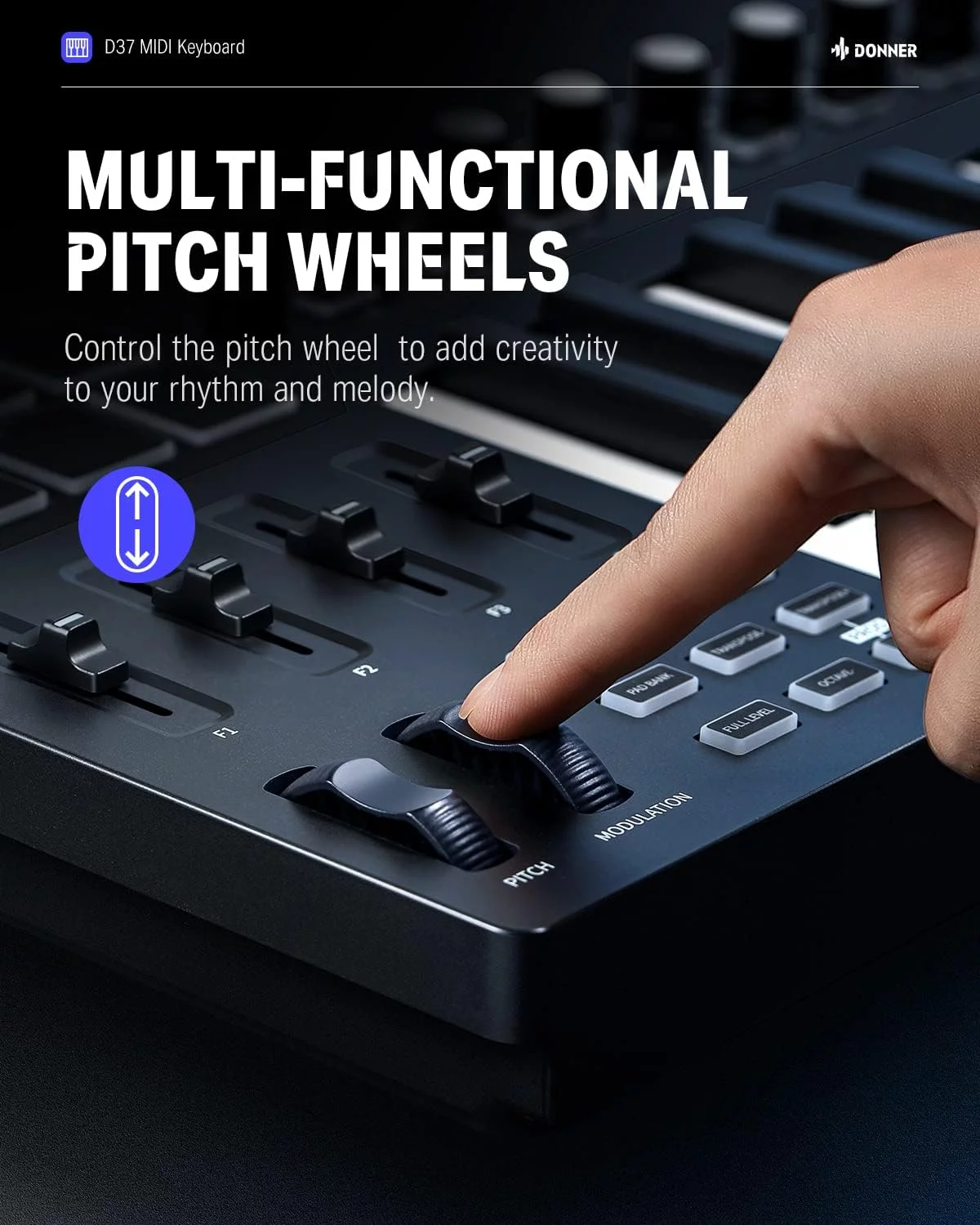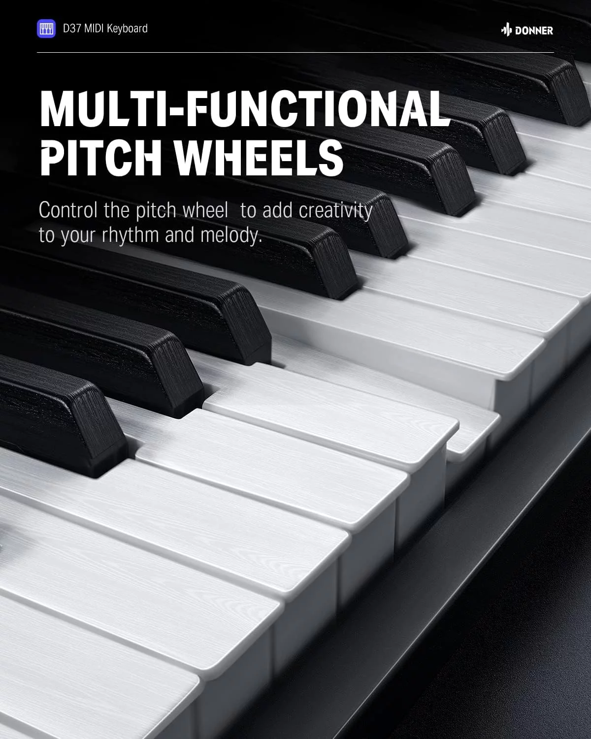 DONNER D-37 Компактная MIDI клавиатура с 37 чувствительных к скорости нажатия и послекасанию клавиш. Функции сдвига полутонов и октав позволяют получить доступ к тому же диапазону, что и на полноразмерной клавиатуре.