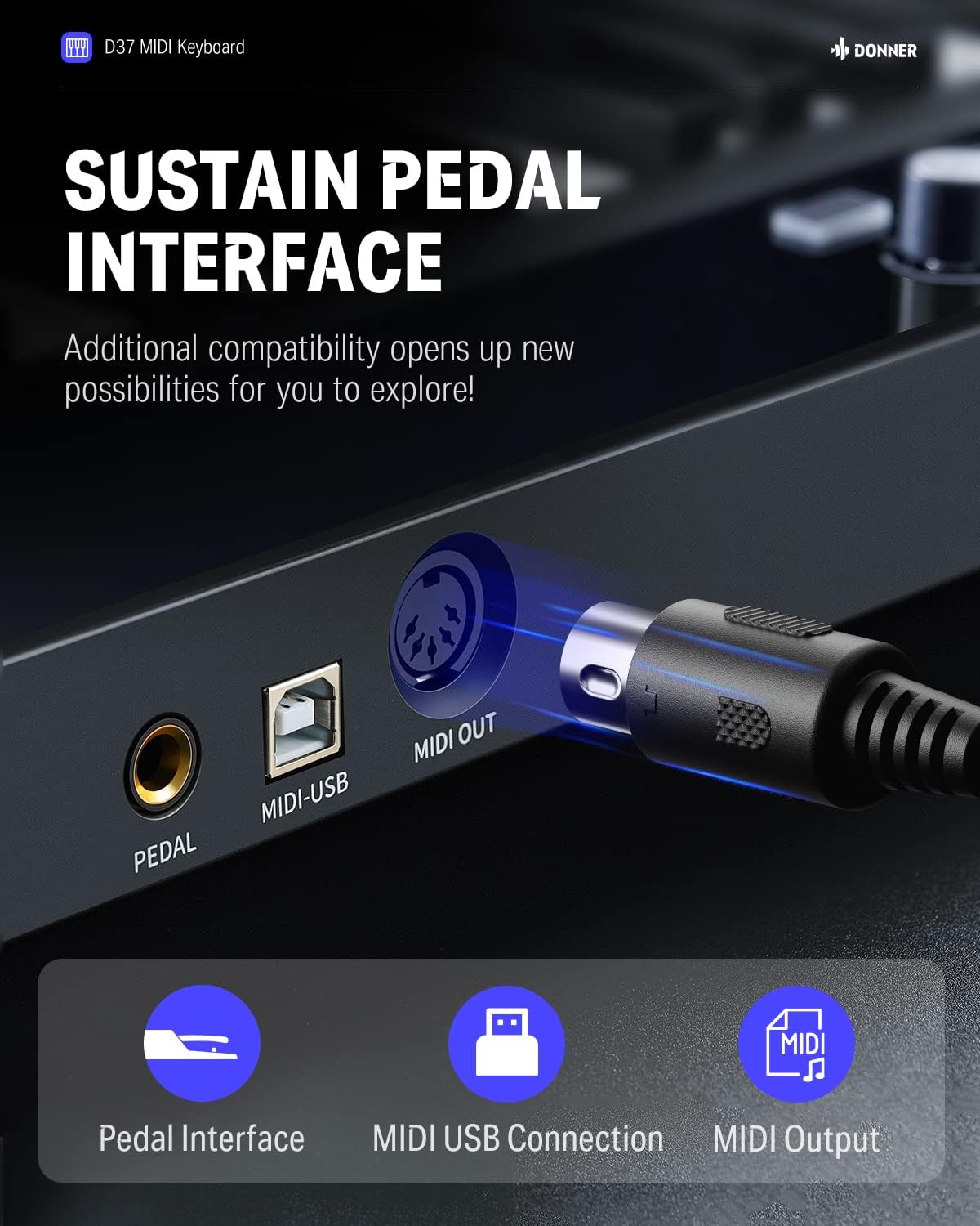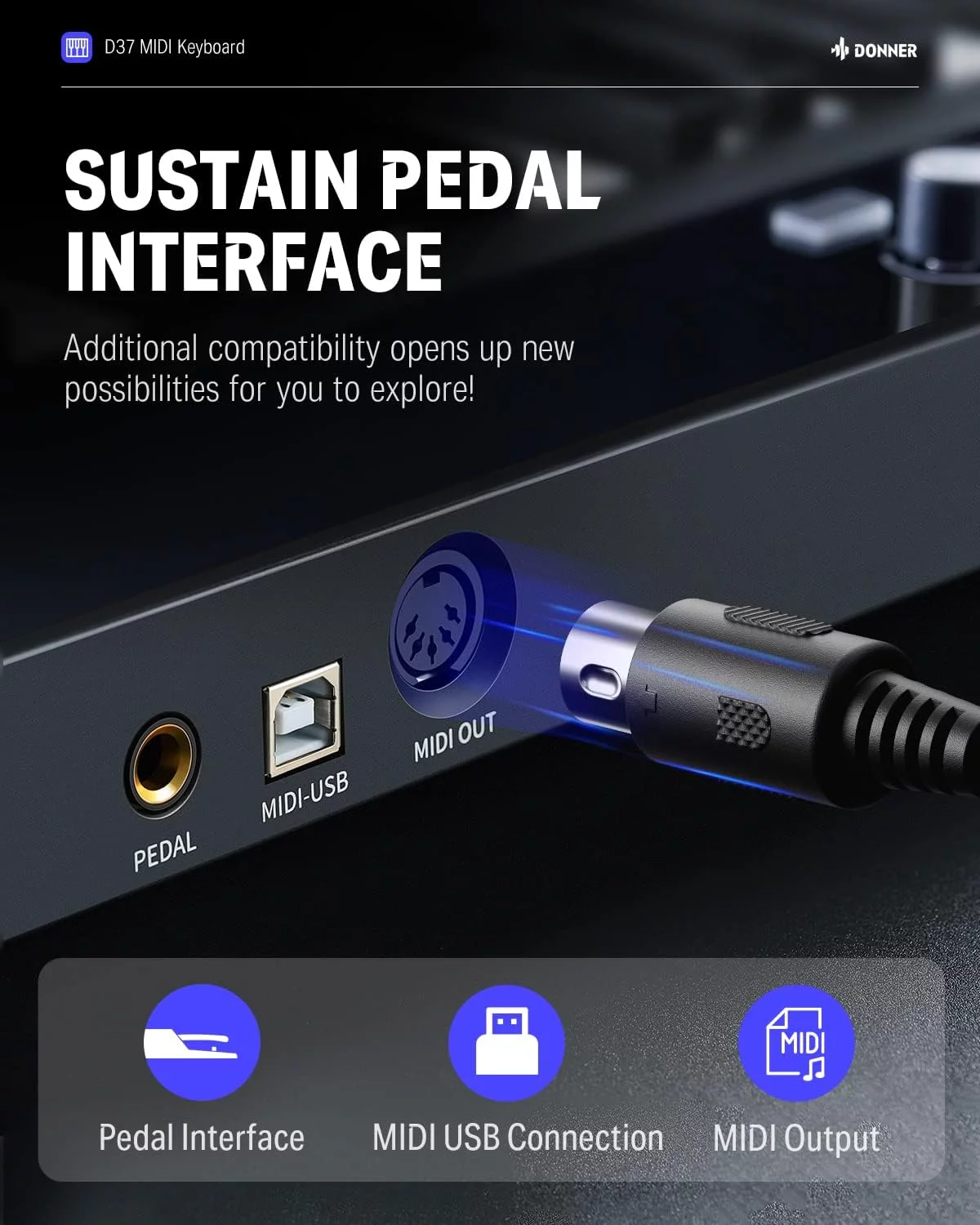 В дополнение к подключению MIDI USB, DONNER D-37 также имеет MIDI-выход и интерфейс педали. Дополнительная совместимость открывает перед вами новые возможности для изучения!