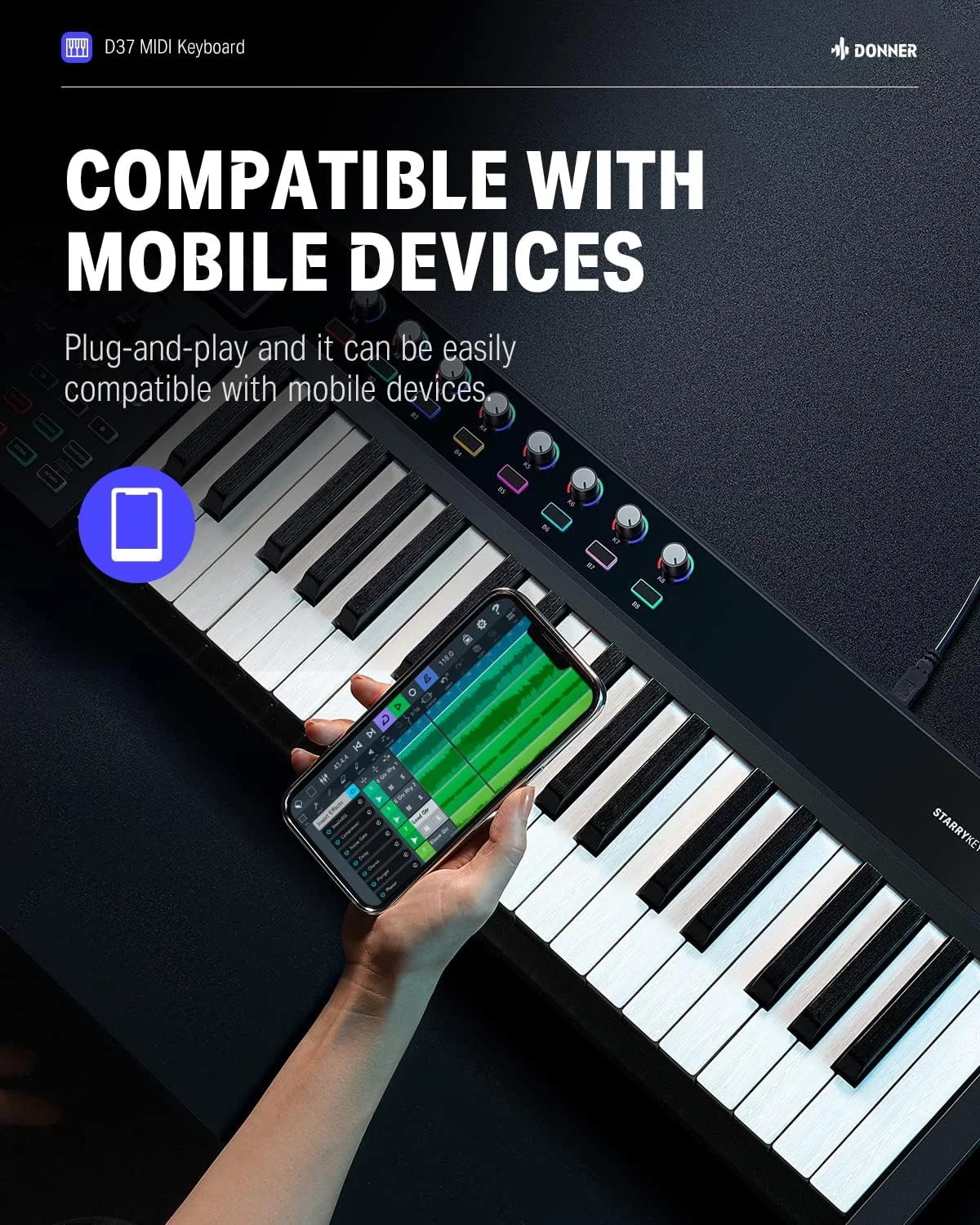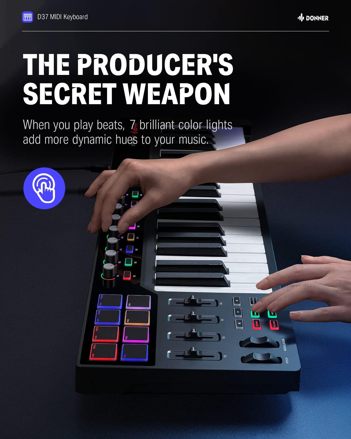 Клавиши стандартного размера предоставят вам больше пространства для ваших рук и дадут максимальное погружение в творчество. Миди-клавиатура DONNER D-37 идеально подходит для отработки ритмов дома, и выступлений на сцене или в клубе.