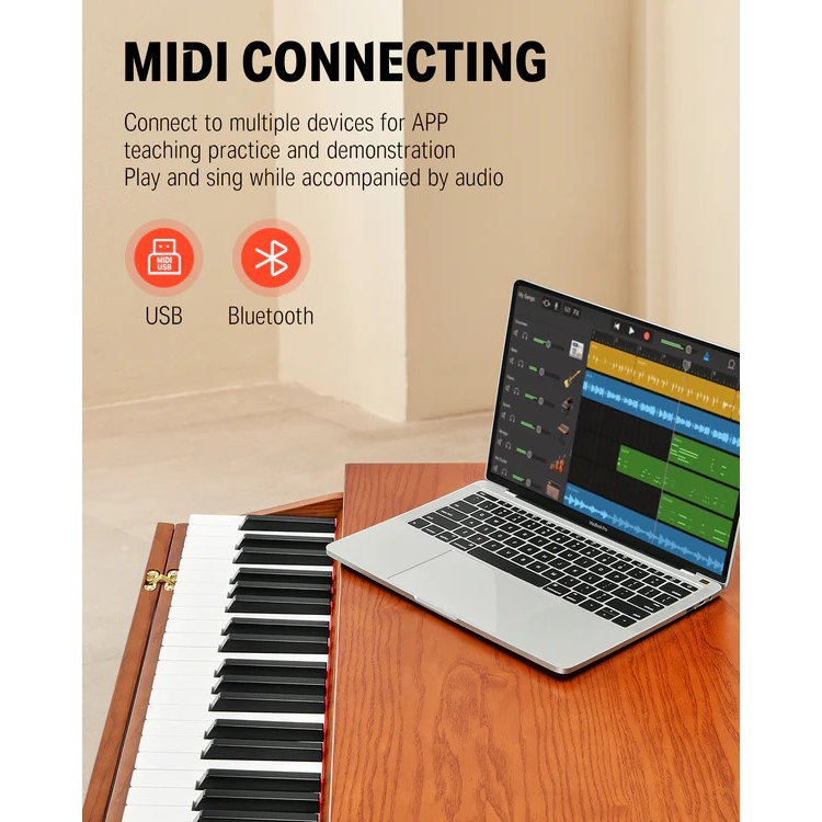• Подключение по MIDI: Подключайтесь к нескольким устройствам для обучения и демонстрации через приложение DONNER APP. Играйте и пойте под аккомпанемент аудио.