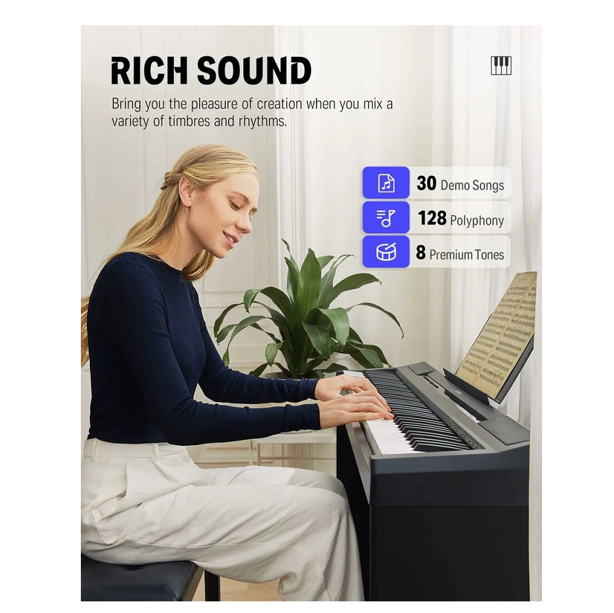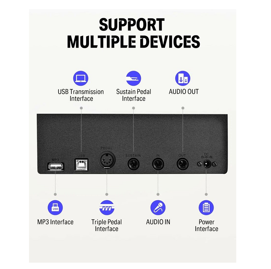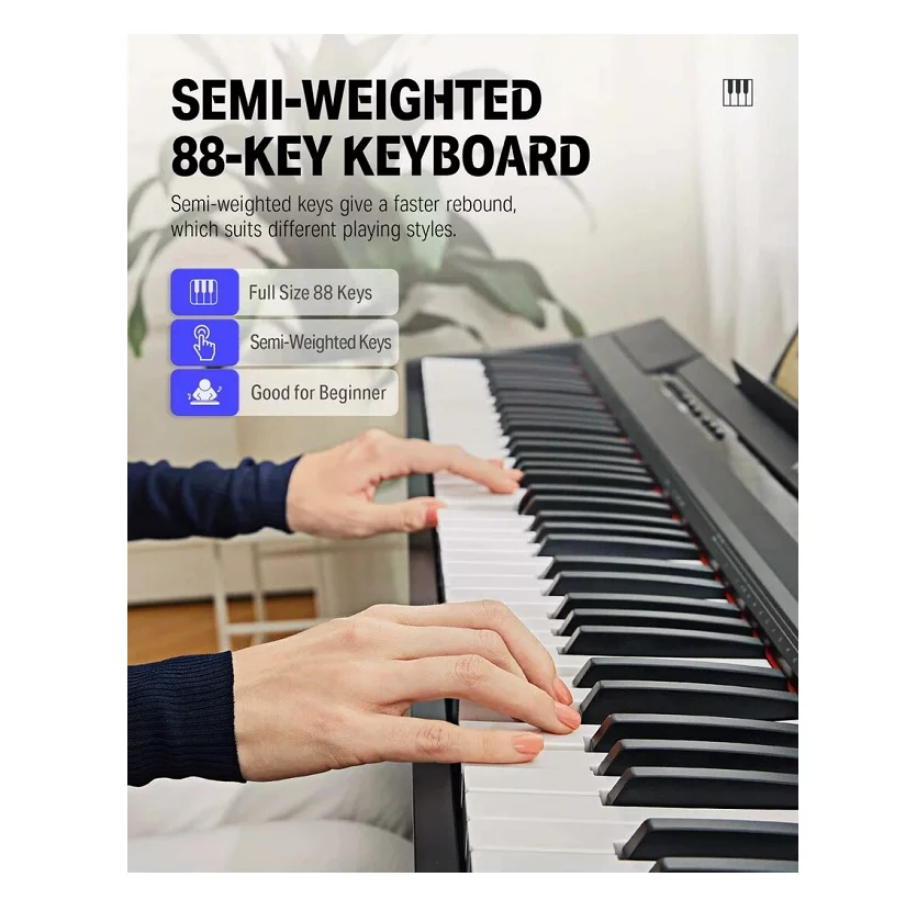 Цифровое пианино Donner DEP-10 оснащено 88 полувзвешенными клавишами, которые имитируют реальное прикосновение к игре на пианино. Полувзвешенные клавиши уменьшают ощущение силы по сравнению с полновзвешенными клавишами, обеспечивая более чувствительную реакцию на прикосновения в соответствии с различными стилями игры, обеспечивают больший контроль и максимальный комфорт при игре.