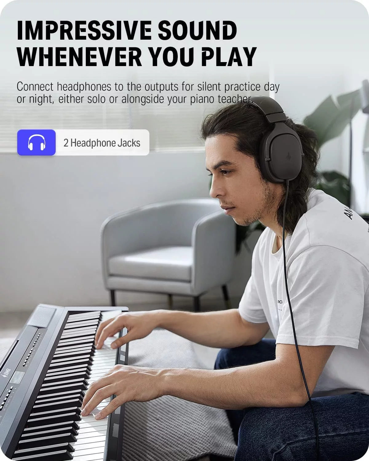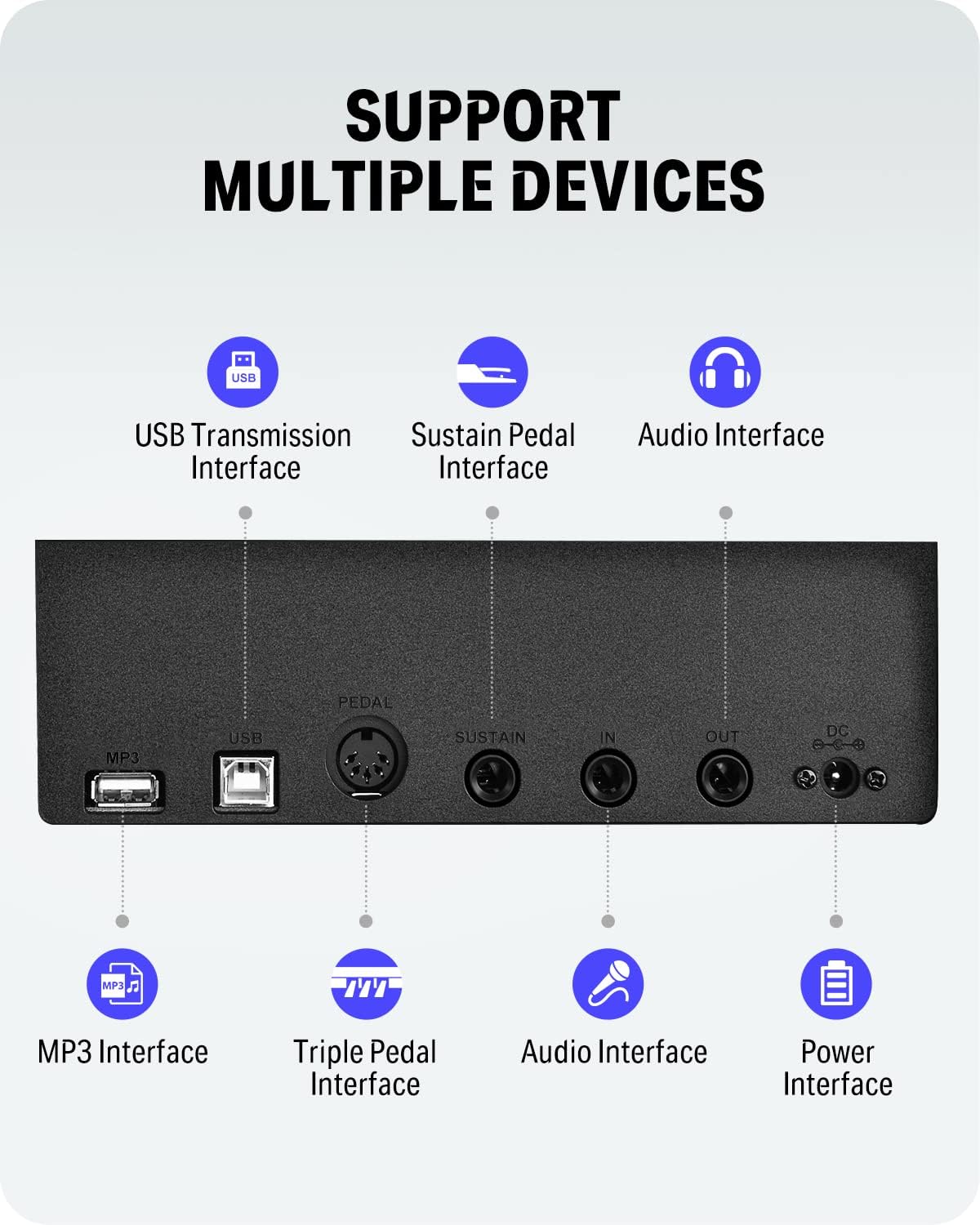 DONNER DEP-20 инструмент с 238 типами тембров, такими как гавайская гитара, барабан, бас и т.д., ярко воспроизводит голоса различных инструментов, пробуждая ваше желание изучать музыку. Цифровое пианино с максимальной полифонией в 128 нот позволяет игрокам четко различать ноты при эффектах хоруса и реверберации в различных комбинациях.