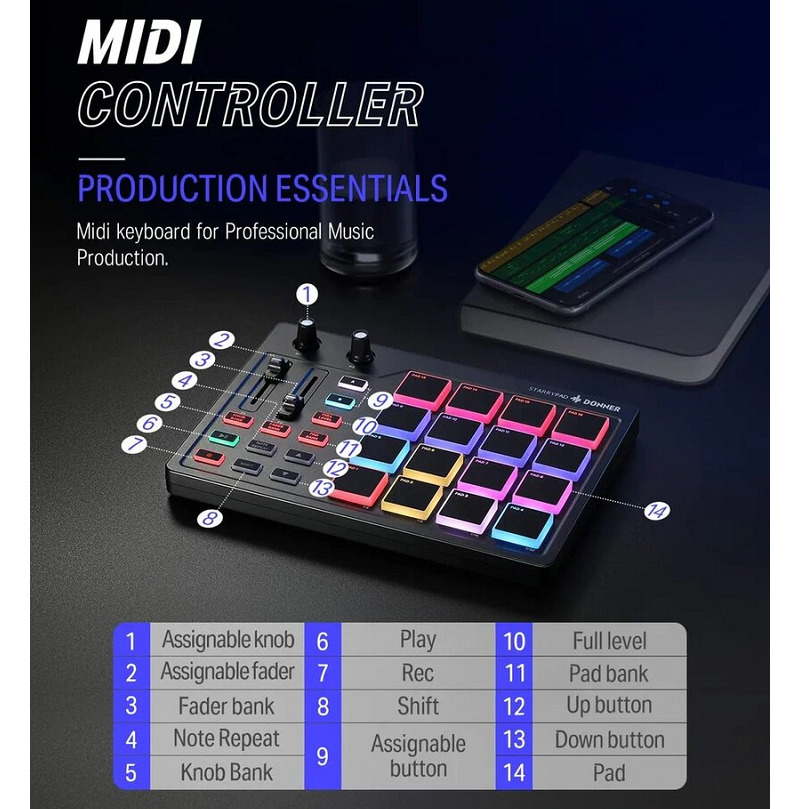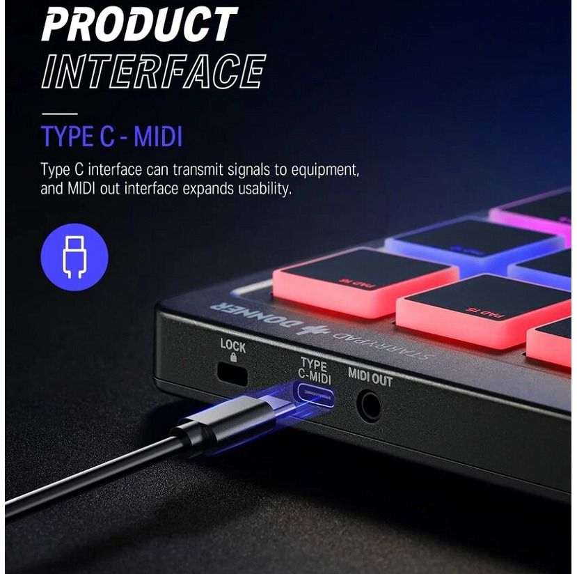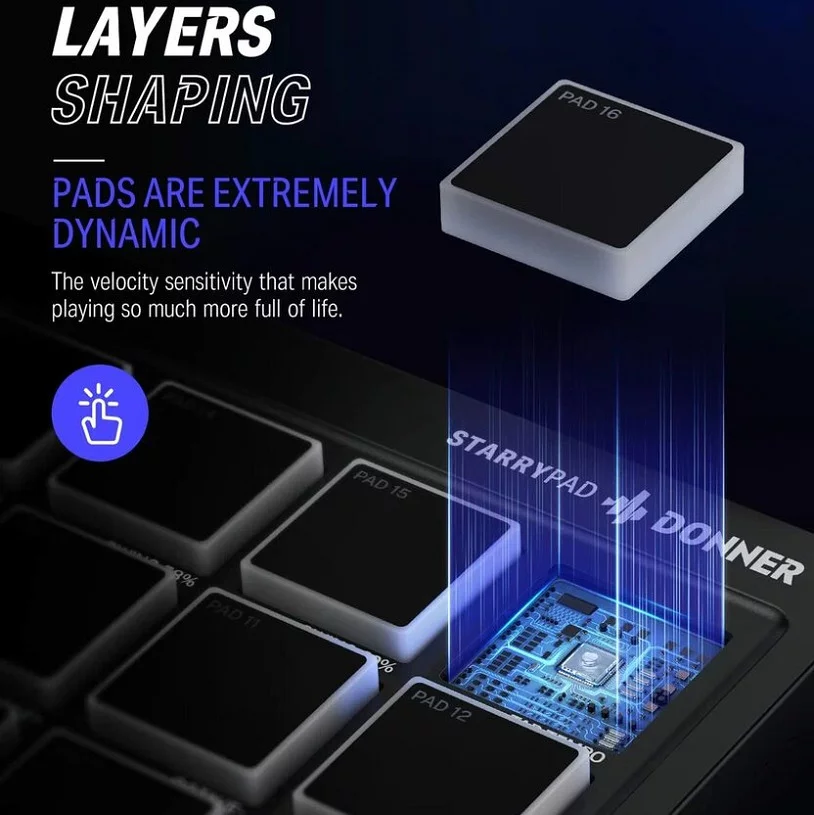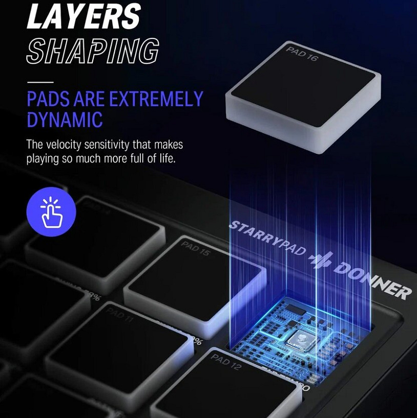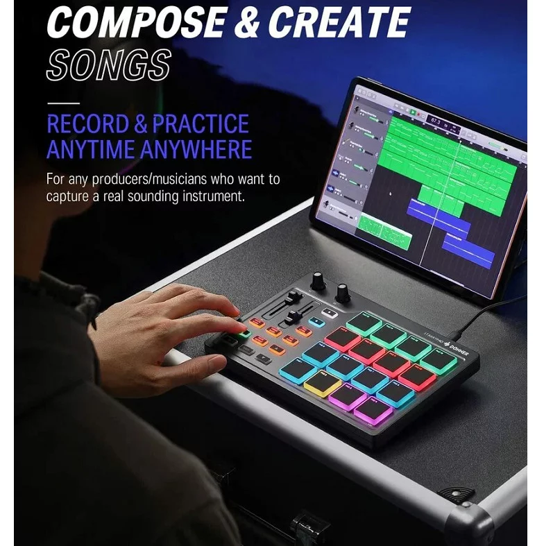 Просто создавайте свою собственную музыку с помощью Donner MIDI Drum Machine Beat Maker, которая поддерживает полифонию и поставляется с регулируемой чувствительностью к скорости, 16 мягких силиконовых пэдов с подсветкой позволяют запускать барабаны, сэмплы, эффекты и многое другое.