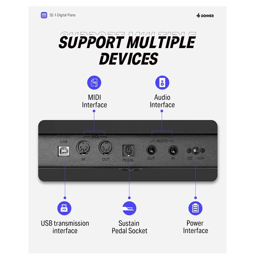 Цифровое пианино DONNER SE-1 с 88 клавишами, обеспечивает двухтембральный режим для объединения двух тембров, таких как фортепианный и струнный, что вдохновляет на творчество. Чип у цифрового пианино включает в себя 200 тембров, 128-нотную полифонию, 100 ритмов, 60 демо-композиций и метроном.