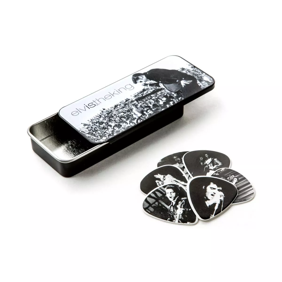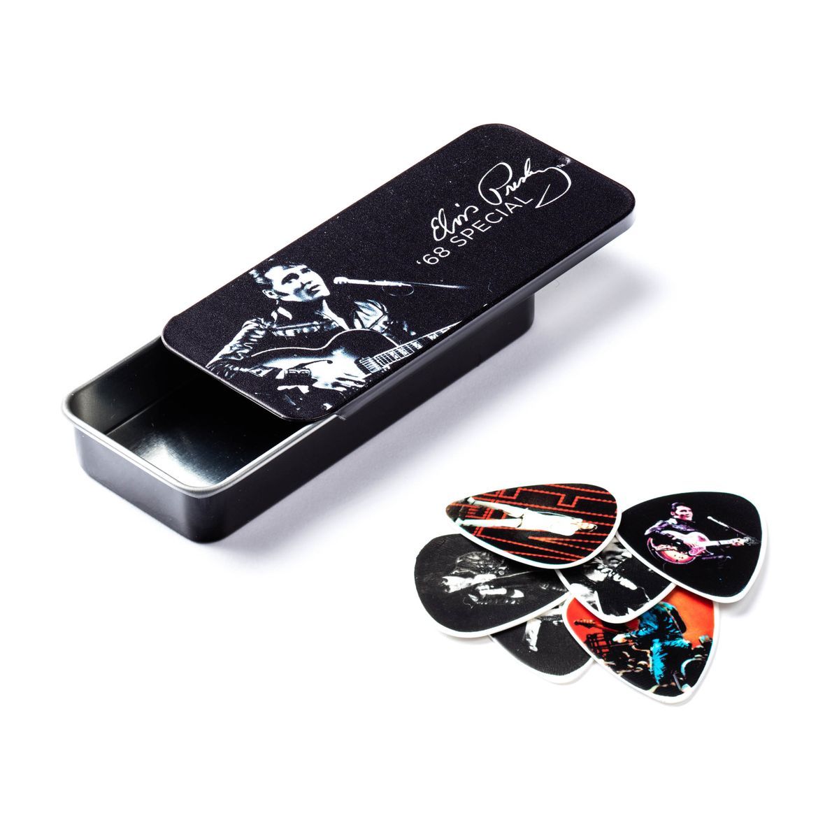 Каждая из коллекционных жестяных коробочек содержит шесть гитарных медиаторов с изображениями с различных стадий жизни Короля.