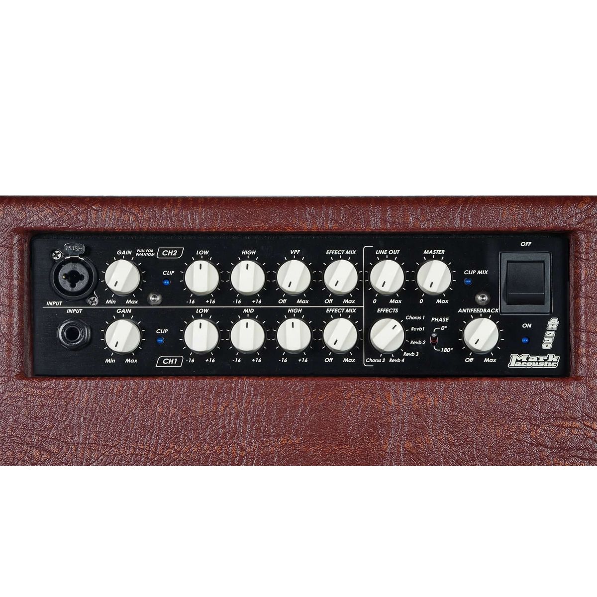 AC 101 H имеет два канала: 1) инструментальный и 2) микрофонный/инструментальный. Оба канала имеют независимые настройки гейна, уровня встроенных эффектов и трехполосные эквалайзеры. Микрофонный вход имеет отключаемое фантомное питание +48В