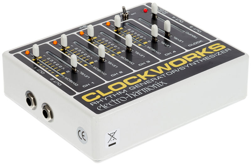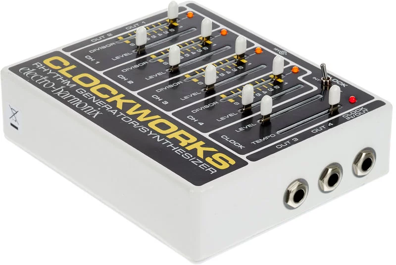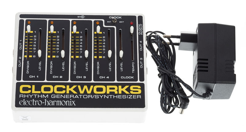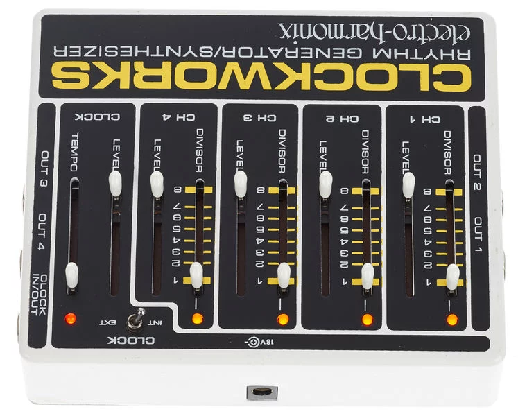 EHX CLOCKWORKS - аналговоый полиритмический "дистпетчер", который может работать как master-clock для аналоговых секвенсоров или драм-машин, а также посылать импульс на триггеры барабанных модулей. Всего имеется 4 выхода на триггеры с независимыми настройками. выходного уровня и дробного деления темпа относительно мастера. Модуль может также работать на приеме внешнего клокинга (мастер-выход в этом случае становится входом).