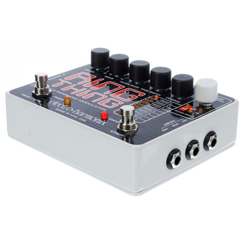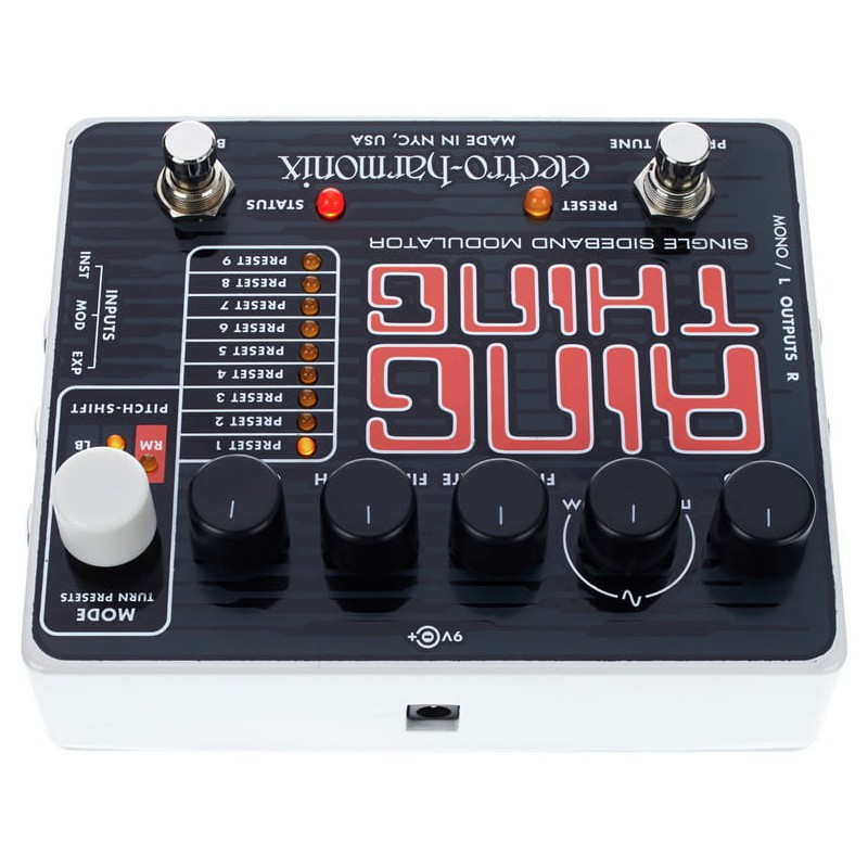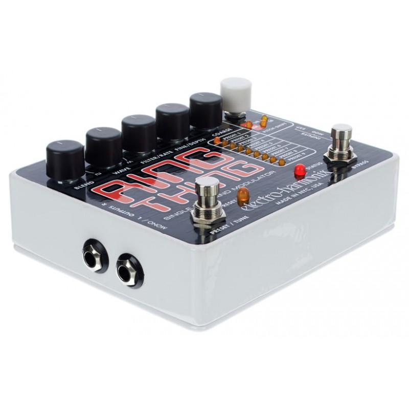 Кольцевая модуляция - эффект не для слабонервных, как на слух, так и с точки зрения работы с ним. Но если вы его освоили, то скорее всего стремитесь раскркрыть все больше и больше возможностей. В этом поможет EHX Ring Thing - самая настоящая станция кольцевой модуляции. Кольцевой модулятор Ring Thing может работать в режиме моно и стерео. В моно режимие на основной выход идет полный микс эффекта , а на дополнительный - необработанный сигнал. В стерео, верхняя и нижняя дополнительные ноты идут на отдельные выходы (можно задать любой вариант их разведения по каналам). Дополнительно к кольцевому модулятору имеется также режим модулированного сдвига высоты тона. Этот режим работает в моно и работает полифонически.