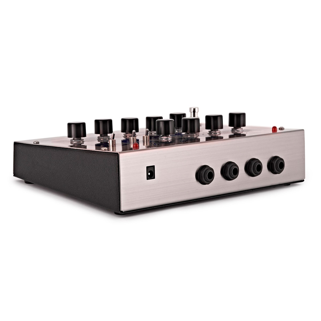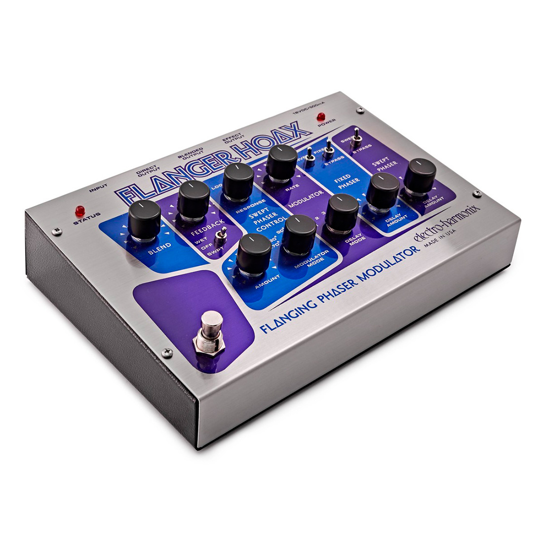 Название педали EHX Flanger Hoax как нельзя лучше отражает ее оргинальную природу. Вы думали это флэнжер? А вовсе нет, это фейзер! Только звучит он почему-то очень похоже на фленжер... Чтобы не путаться, сфомулируем по-другому: это настоящия станция для ценителей и знатоков модуляционных эффектов, любящих и умеющих вдумчиво и творчески тюнинговать параметры и сочинять новые рецепты. Сердцем Flanger Hoax являются две независмых линии фазового сдвига. Одна линия, фиксированная, сдвигающая фазу примерно на 60 или 240 градусов по выбору; вторая - традиционный фейзер, чей сдвиг фазы модулируется осциллятором LFO. При этом в конце каждой линии находится собственная секция задержки с модуляцией "хвостов" и характер этой модуляции имеет свои настройки. И теперь самое главное - можно использовать обе линии вместе, или по отдельности, а в рамках каждой линии использовать фейзер + задержку, или только фейзер, или только задержку. Это уже полтора десятка вариантов сигнального тракта, без учета пяти переключаемых режимов модуляции линии задержки, пяти режимов стартового сдвига фазы на модулируемом фейзере, а также трех режимов обратной связи. Про подстройку регулируемых параметров и не говорим. Готовый к употреблению результат доступен одновременно виде микса обработанного и исходного сигнала (на отдельном выходе) или только обработанного сигнала (тоже на отдельном выходе), плюс имеется выход с необработанным сигналом. Если вы дочитали до конца и не испугались - это педаль для вас!