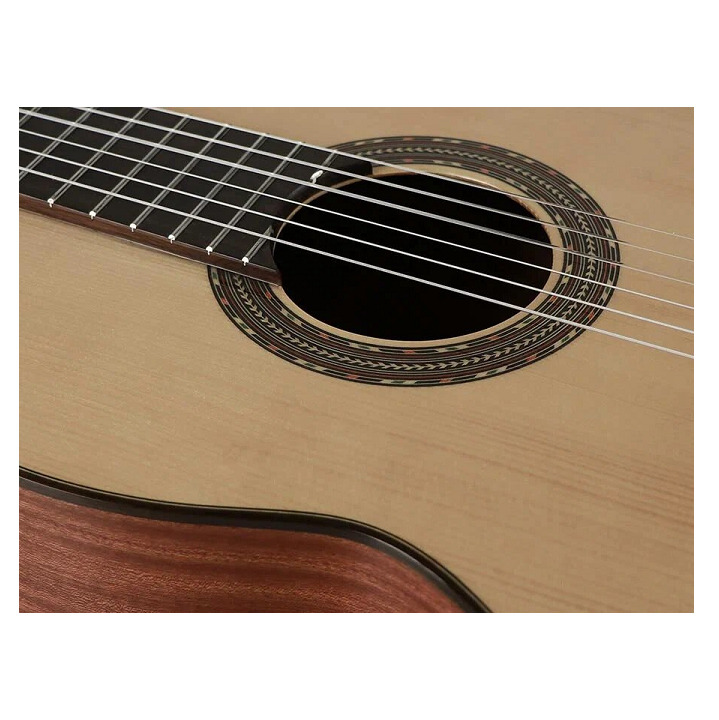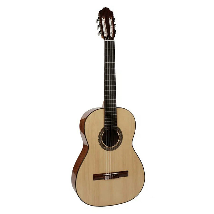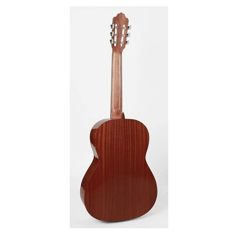 Классическая гитара 4/4, верхняя дека - массив ели, нижняя дека и обечайка - сапелли, гриф - окуме, накладка на гриф - палисандр, цвет натуральный.