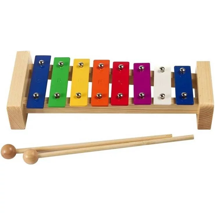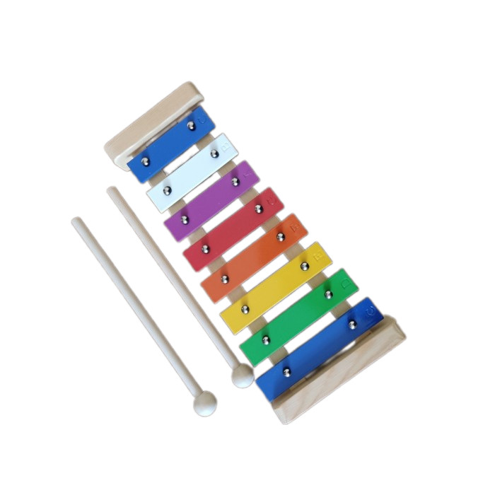 Данная модель имеет 8 разноцветных металлических пластинок, на каждой указана соответсвующая ей нота, в комплекте прилагается деревянная палочка для игры.