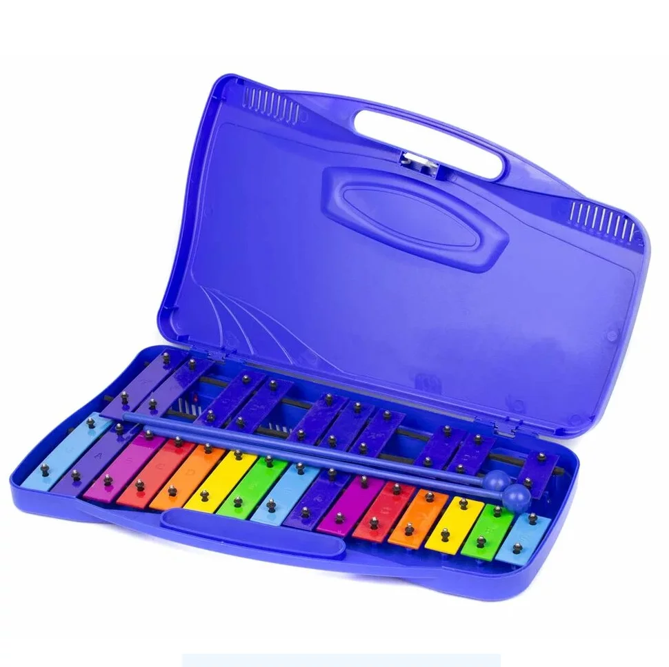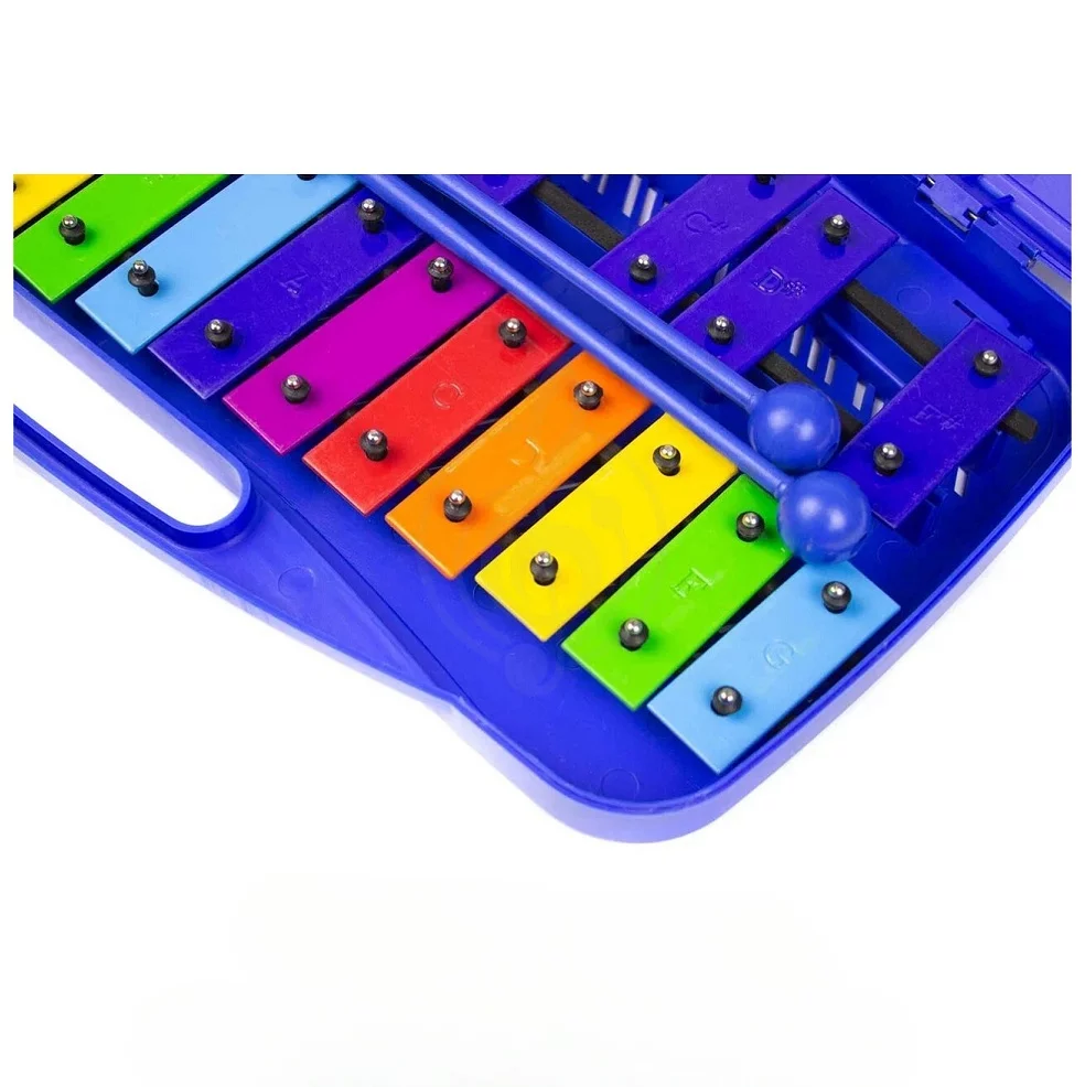 Данная модель имеет 25 разноцветных металлических пластинок, на каждой указана соответсвующая ей нота, в комплекте прилагаются палочки для игры.