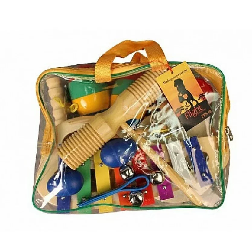 Перкуссионный набор FLIGHT FPS-10 состоит из 10-ти предметов, оформленных в красочном стиле: разноцветного металлофона с палочкой, круглого тамбурина с натуральной мембраной, пары разноцветных маракас, пары пластиковых кастаньет, пары шейкеров в форме "яиц", цимбал, гуиро, тон-блока, металлического треугольника с палочкой и джингл-стика.